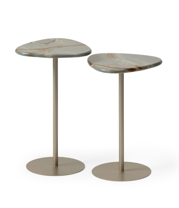 The Alva side table conveys structural lightness. Its lacquered metal base supports a pick-shaped top, available in natural stone.
