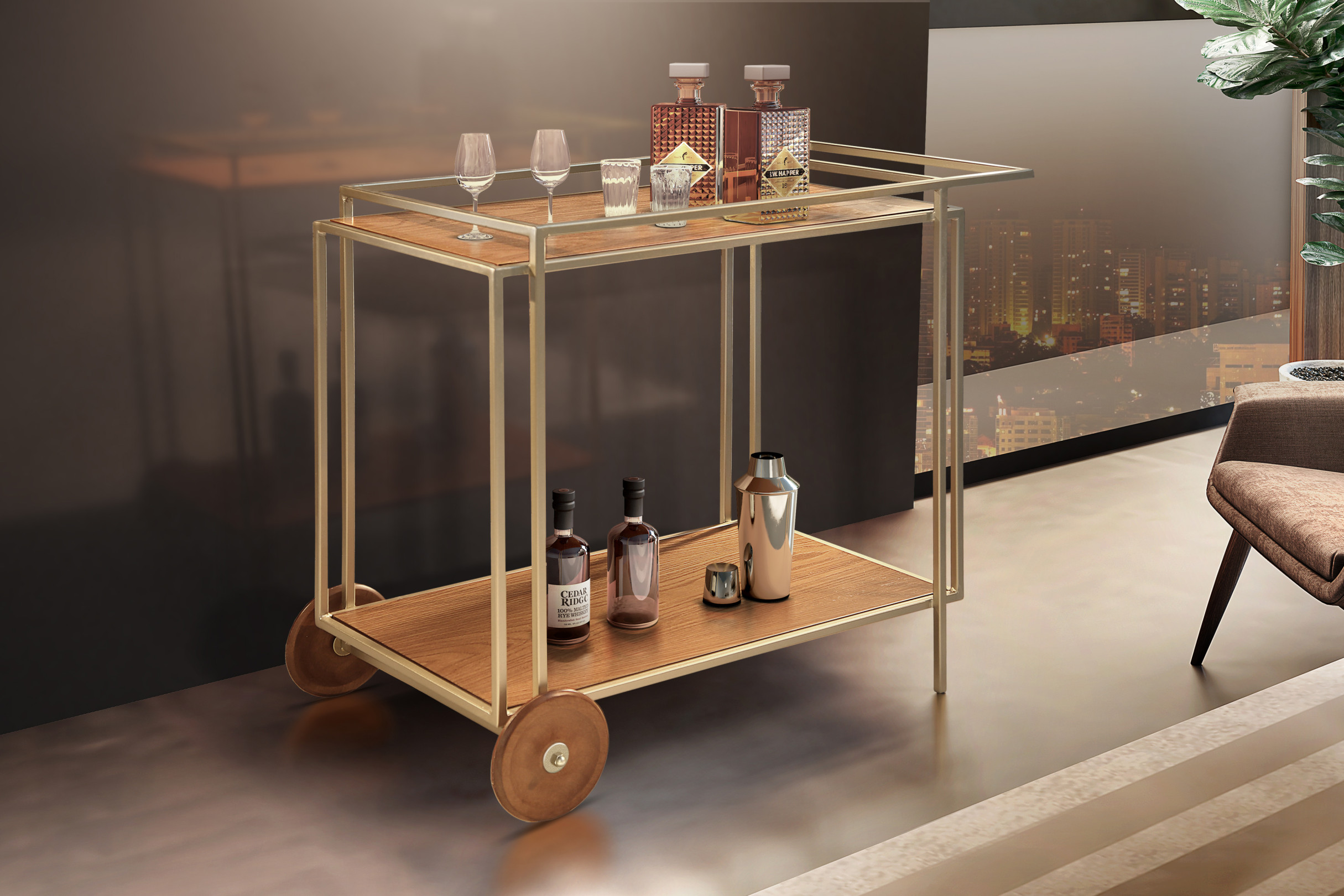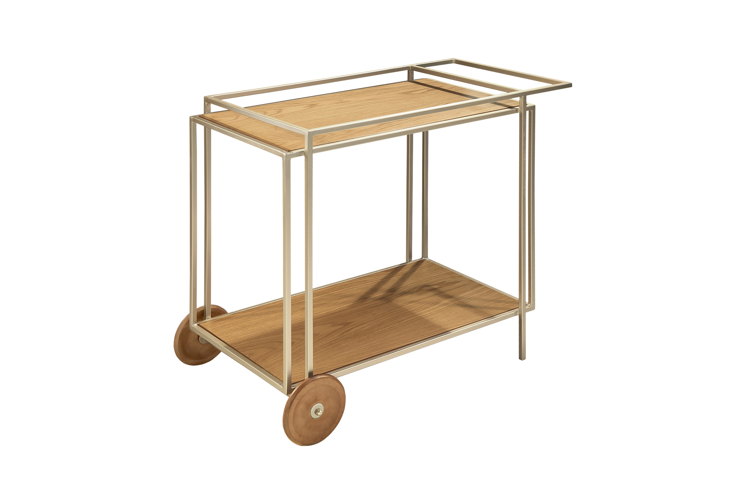 The Amsterdam bar features a metal structure, MDF tops finished with natural wood veneer or lacquer, and solid wood wheels.