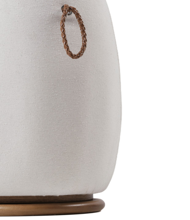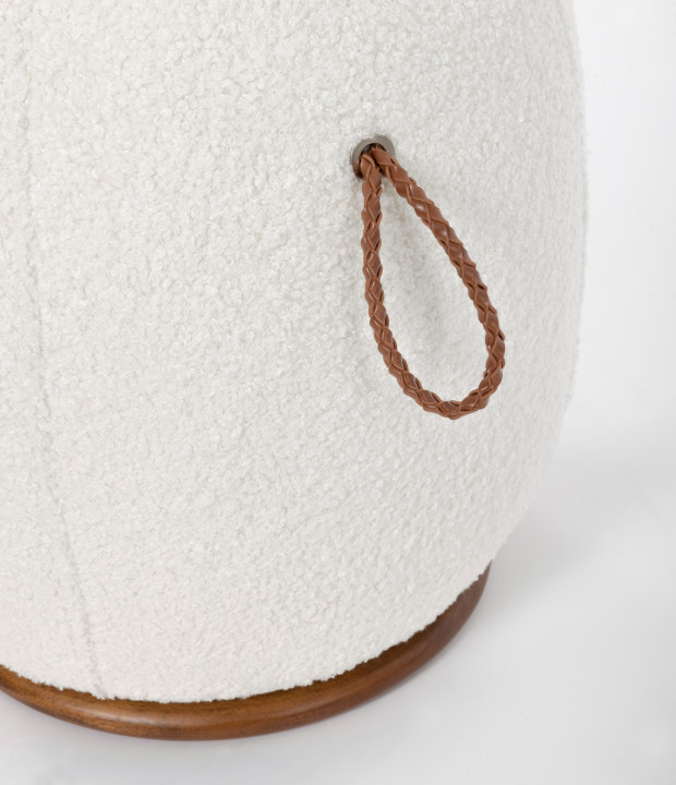 Puff with MDF structure covered in fabric, solid wood base, and braided bonded leather handle.