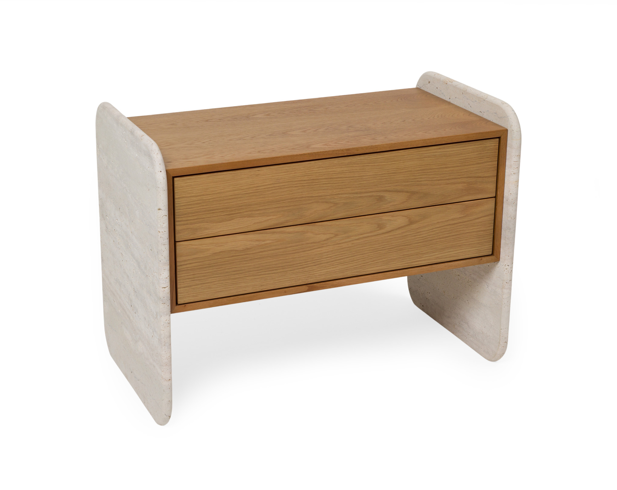 Nightstand in laminated or lacquered MDF. The sides may be in stone or solid wood. Features pushopen