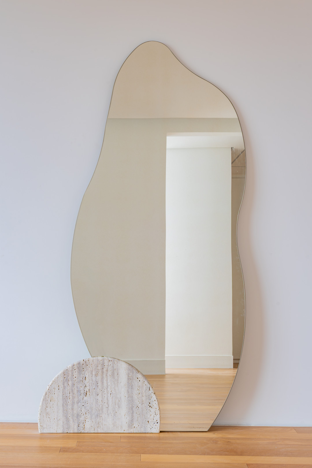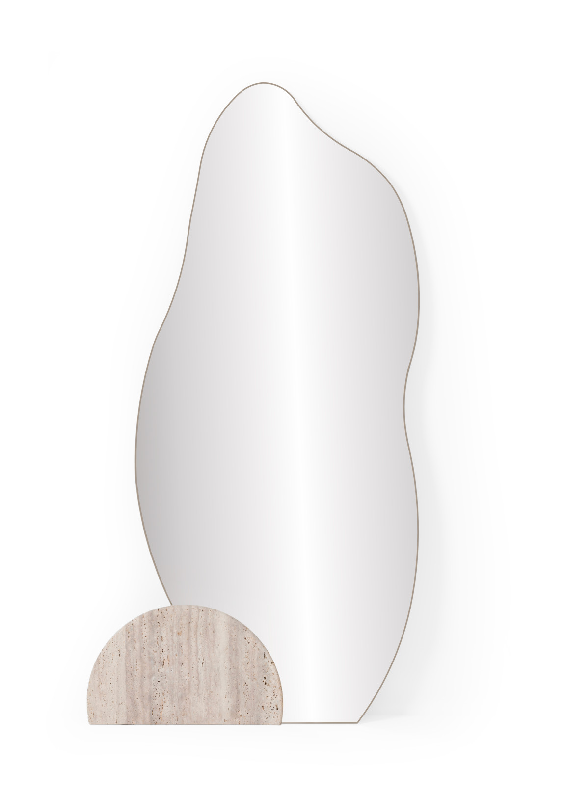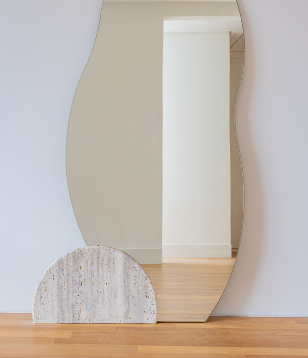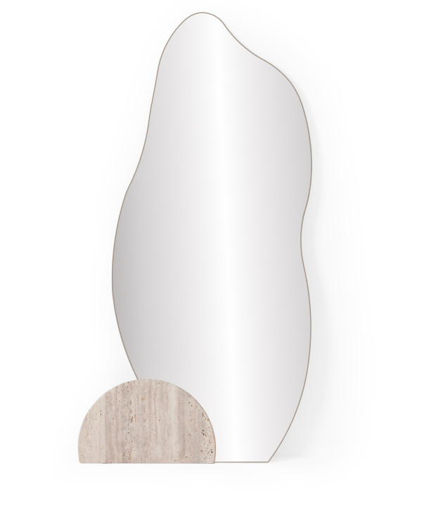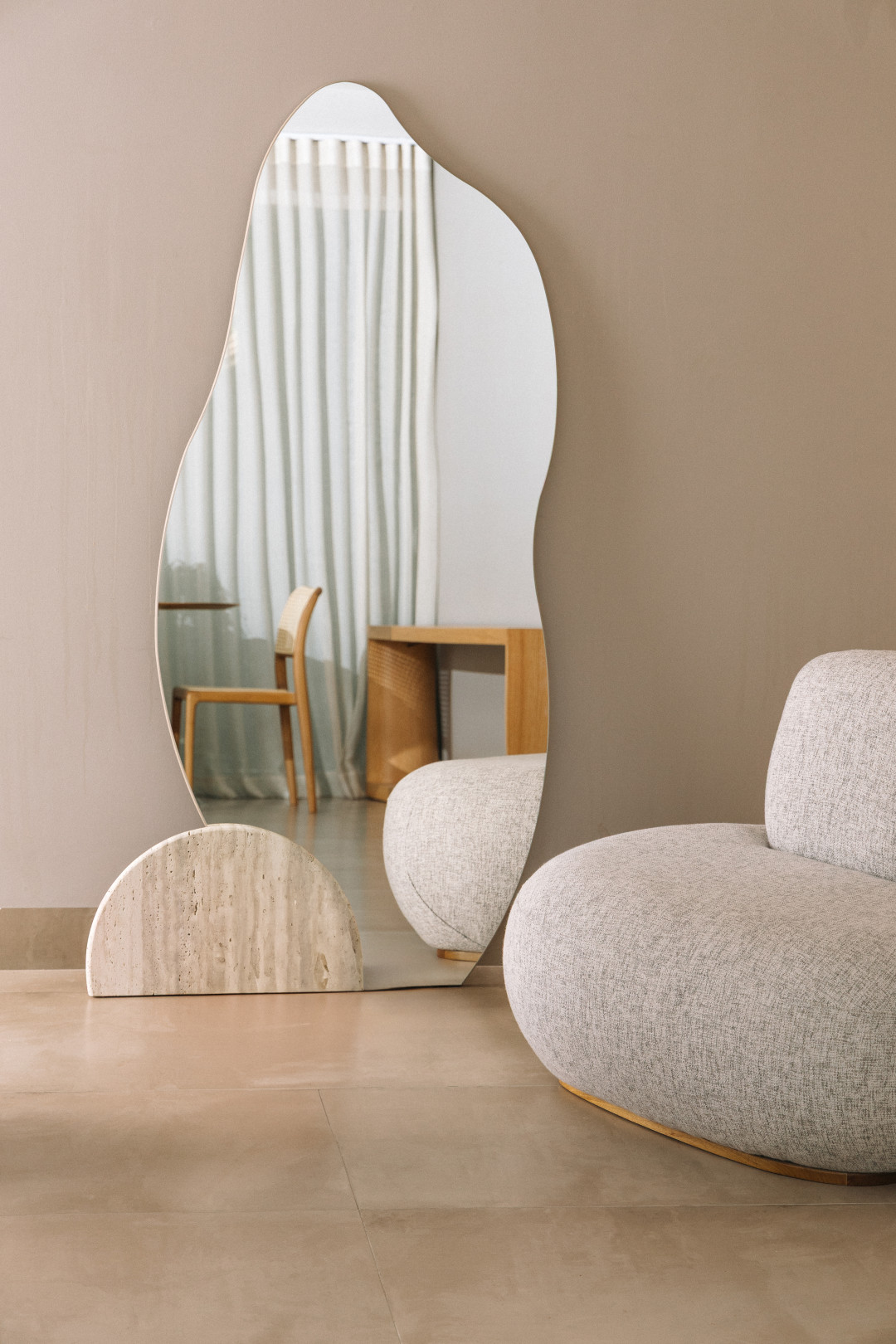 The Casulo Mirror features an MDF structure and a semicircular base available in natural stone, solid wood, or lacquered MDF. With a subtle presence, the piece suggests balance and contemplation.