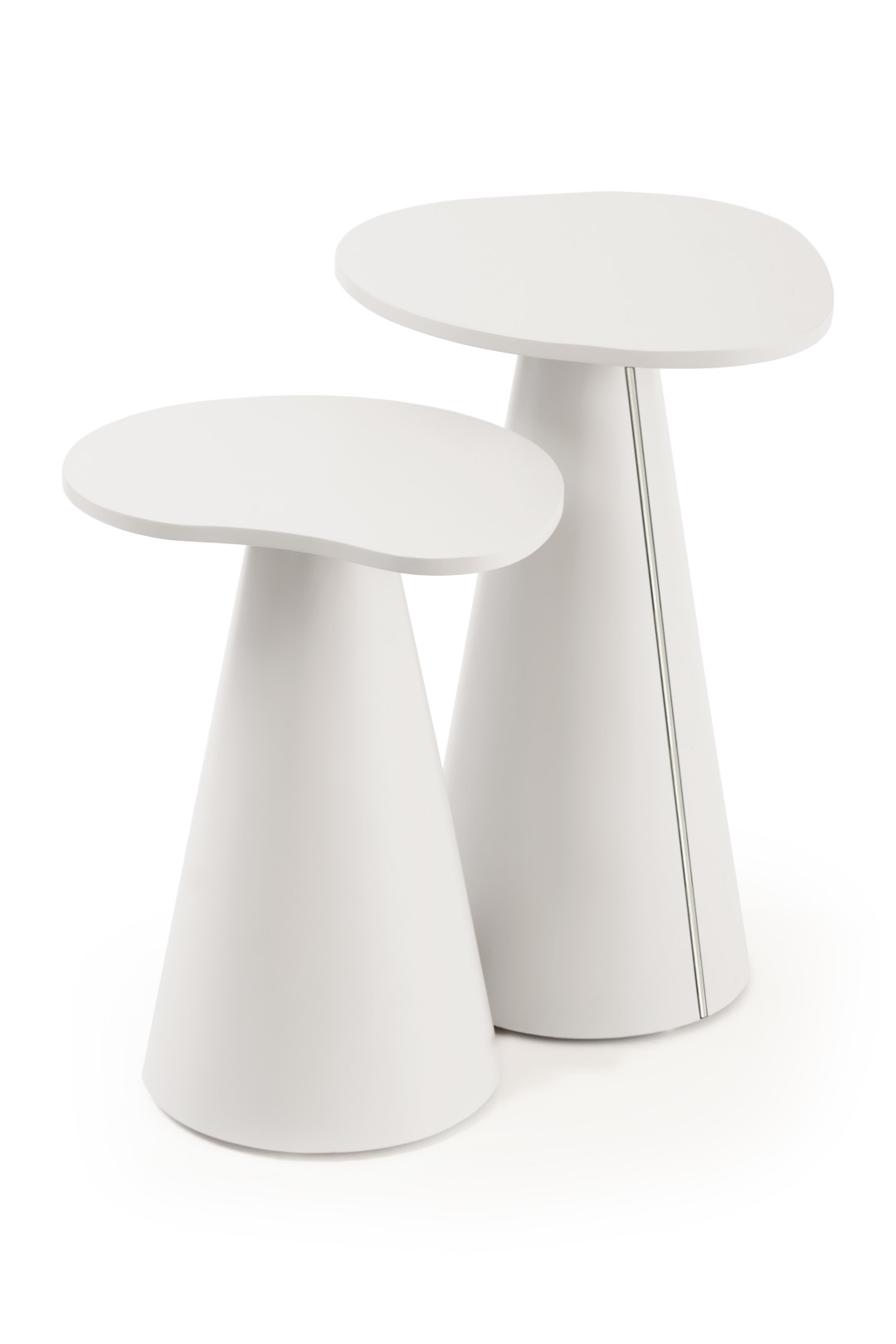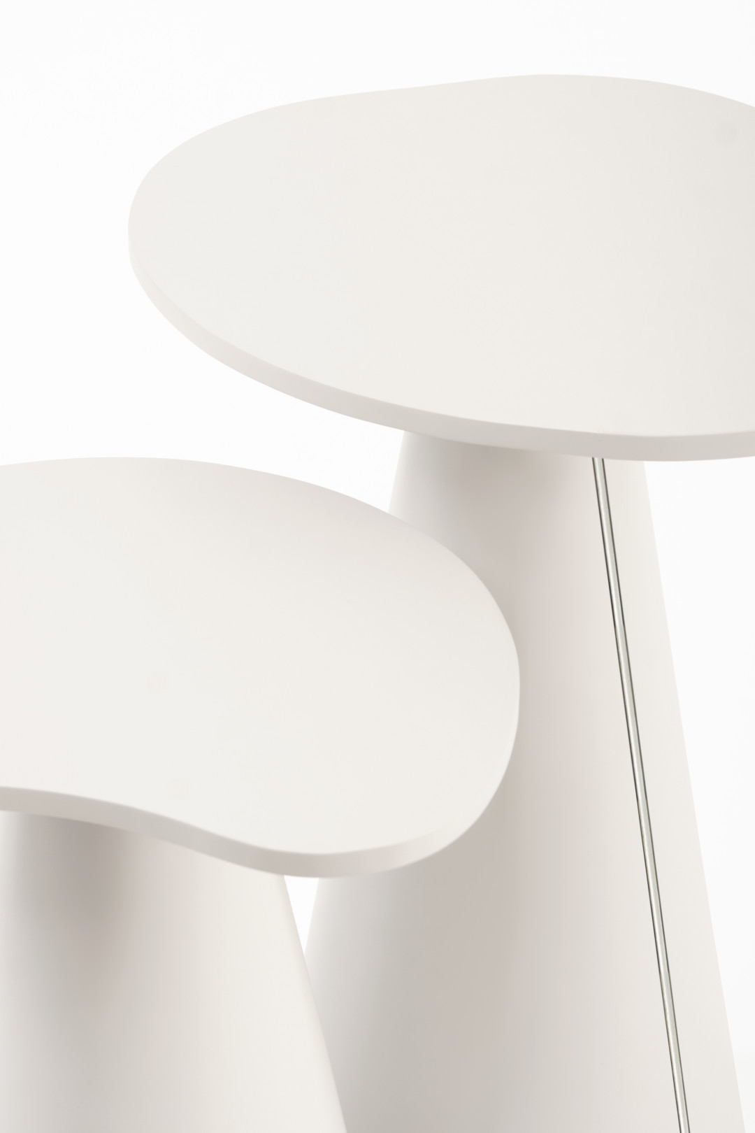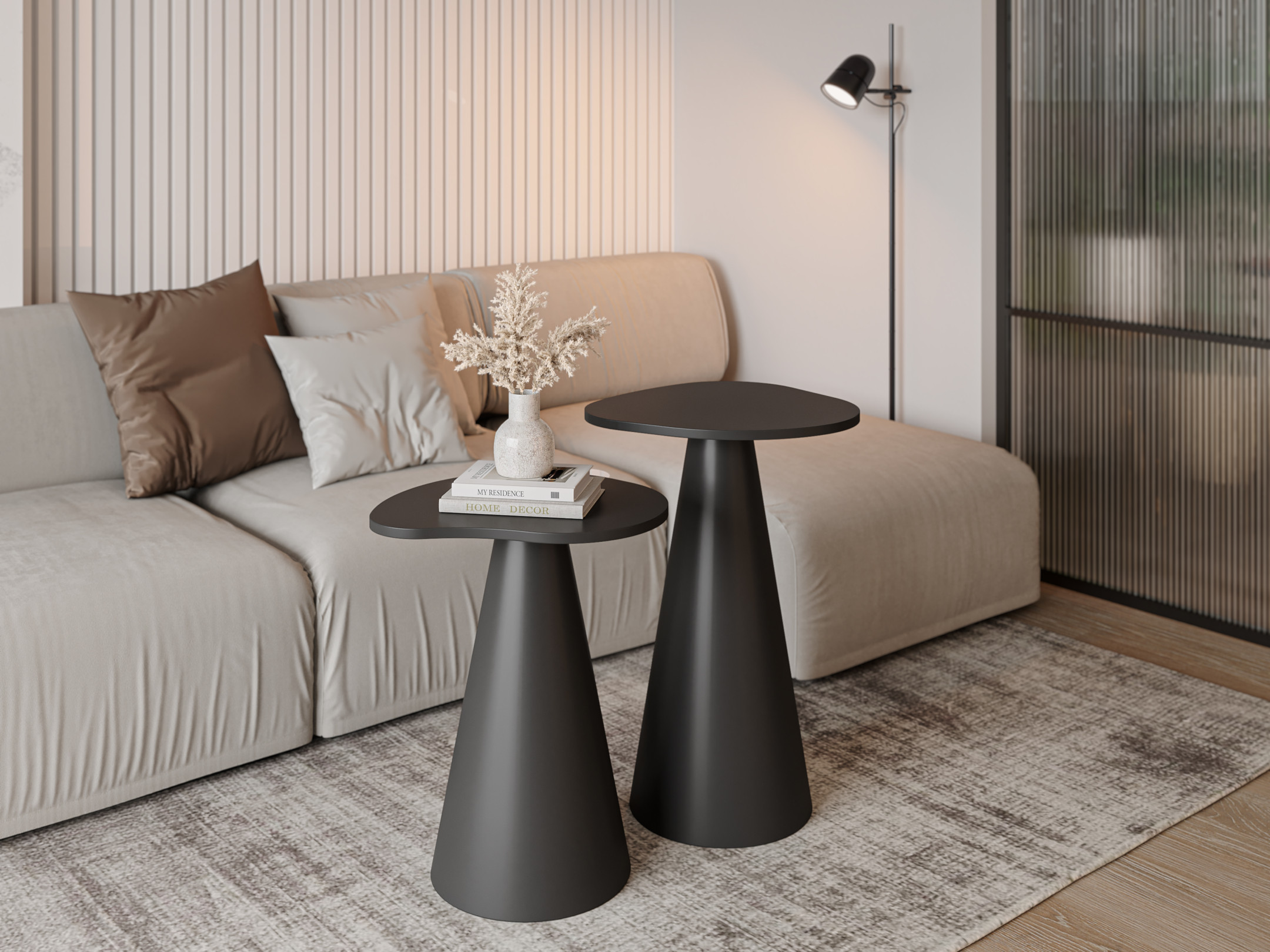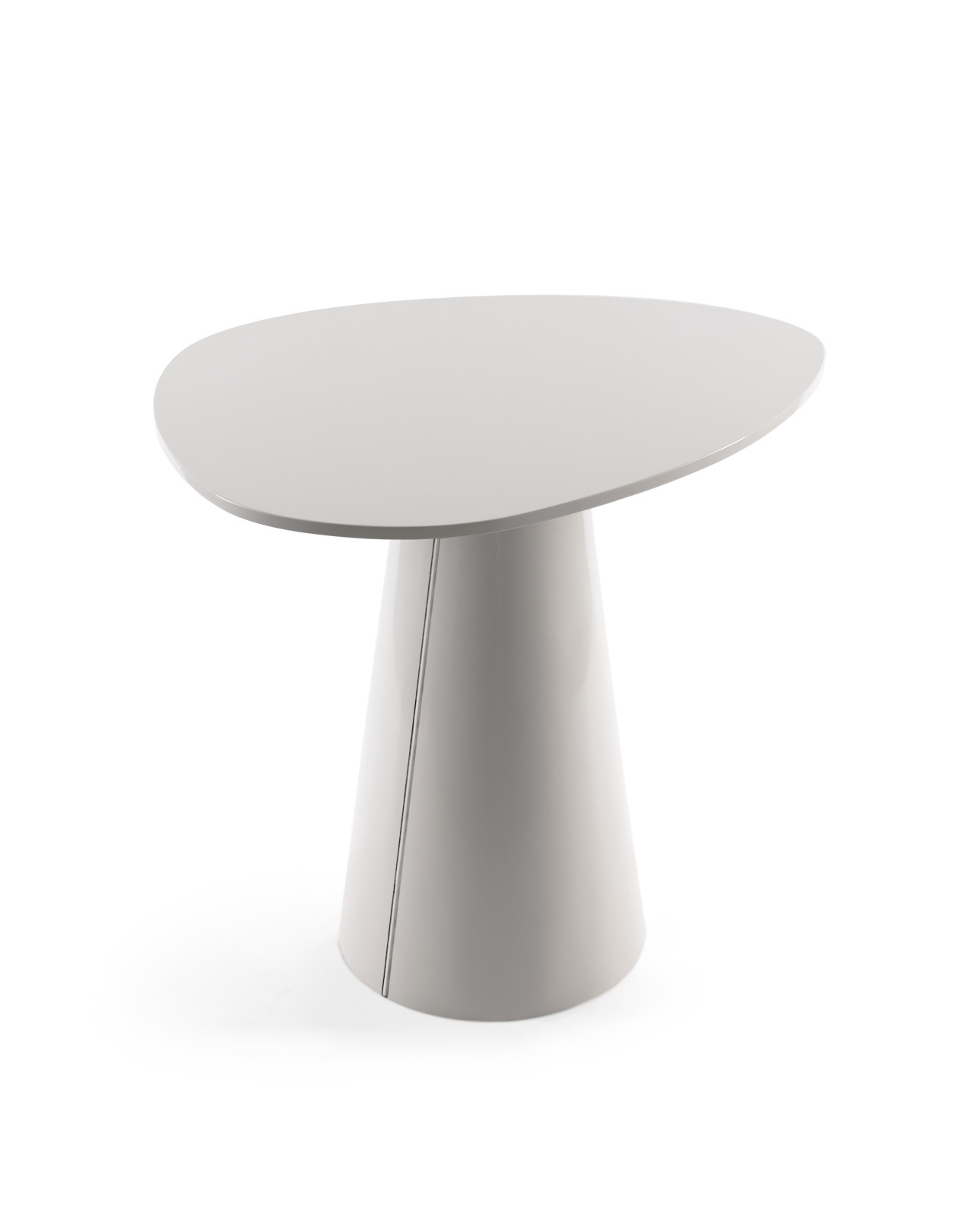 The Colina side table is made of MDF with a lacquered finish or natural wood veneer, featuring a carbon steel detail at its base. It is available in three sizes with different top shapes. The top can be made of stone, lacquered MDF, or natural wood veneer.
