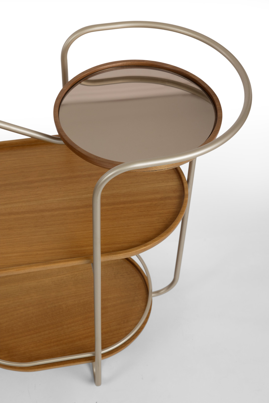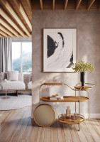 The Dintorno bar cart is a compact and practical piece, featuring a metal base and shelves in solid wood or lacquered wood, along with a bronze mirror on the upper shelf. With an organic design and fluid lines, it stands out in narrow spaces such as dining rooms, living rooms, and offices. The name "Dintorno" suggests contours, reflected in the design that includes spacious shelves, an inverted stemware holder, and upper supports.