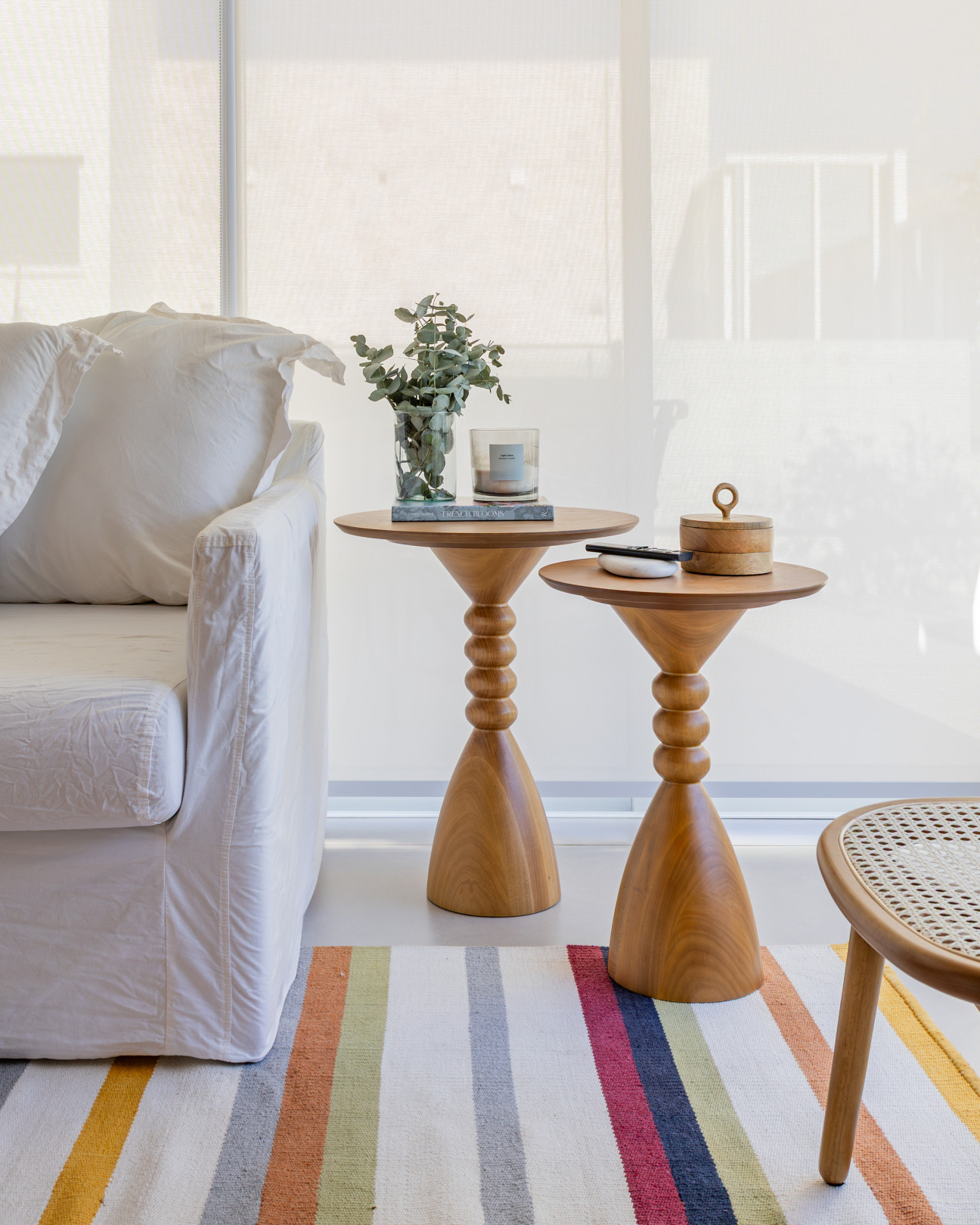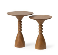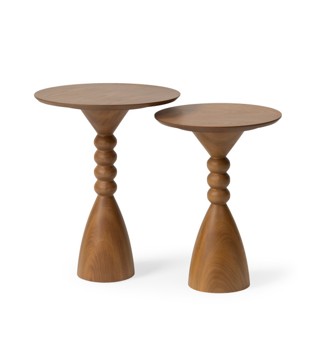 Produced in solid wood or lacquered MDF, the Joana side table celebrates the past and reveals an aesthetic that blends the organic with the geometric. Its base is formed by a turned volume that alternates rounded segments and a bulged conical surface, creating a visual interplay of solids and voids, curves and symmetry.