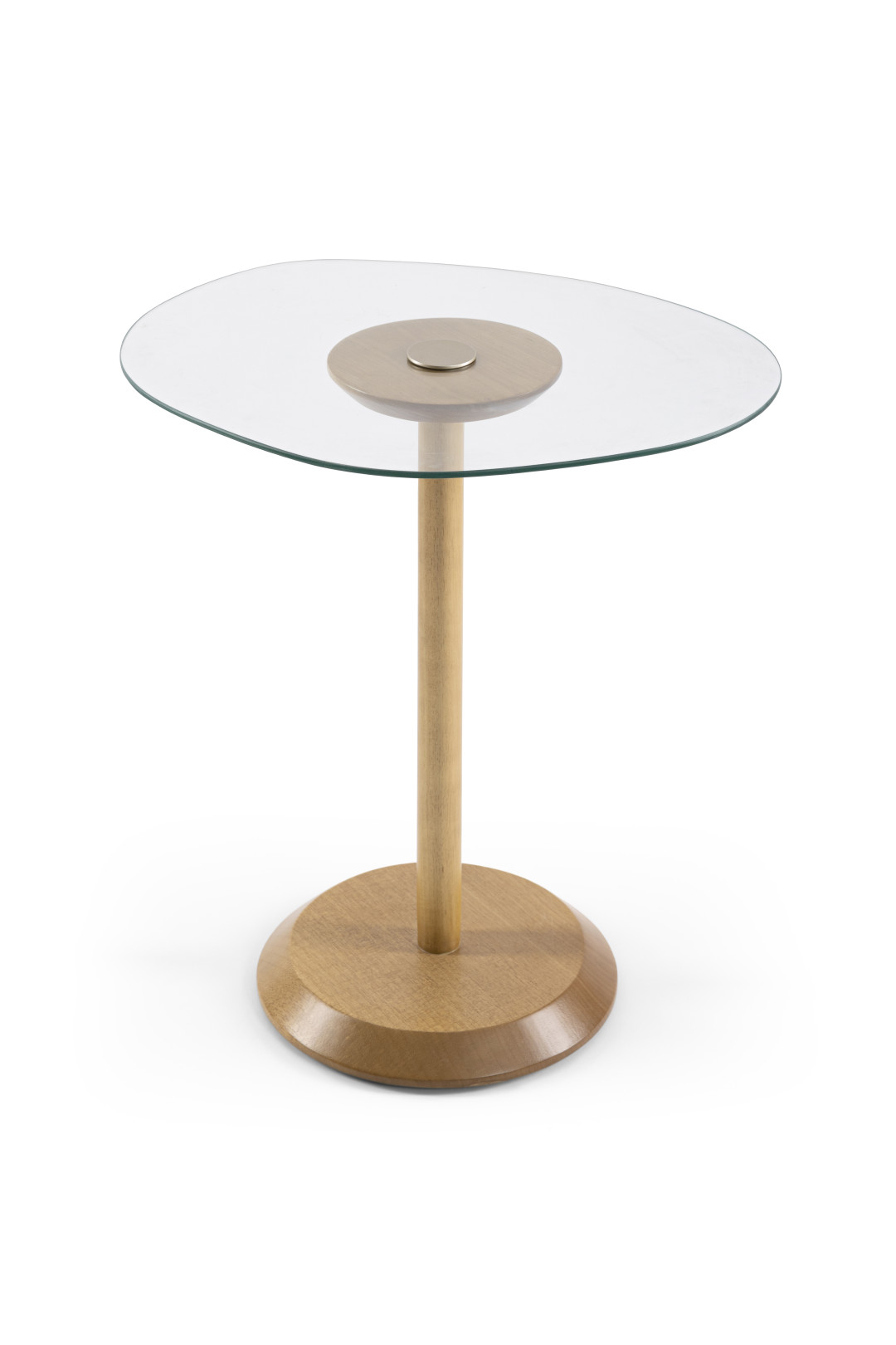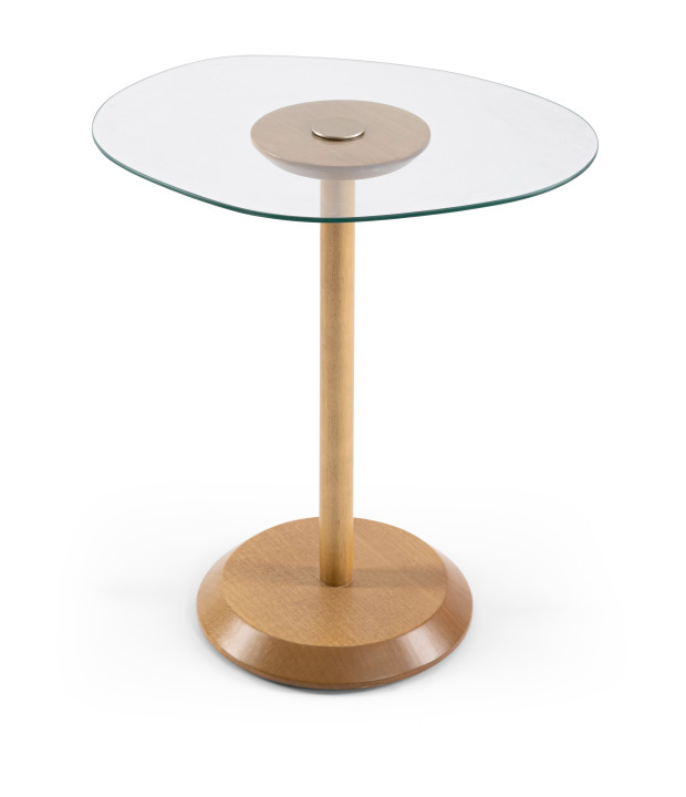 The Lagom side table features a translucent glass top with an organic shape, solid wood legs, and a steel detail on its surface. It is also available with lacquered legs.