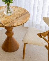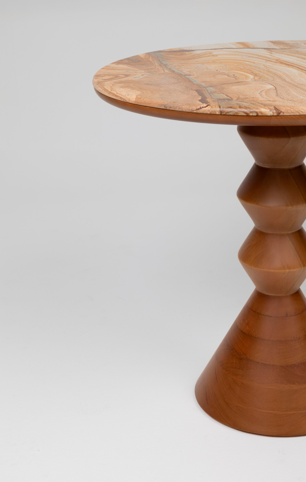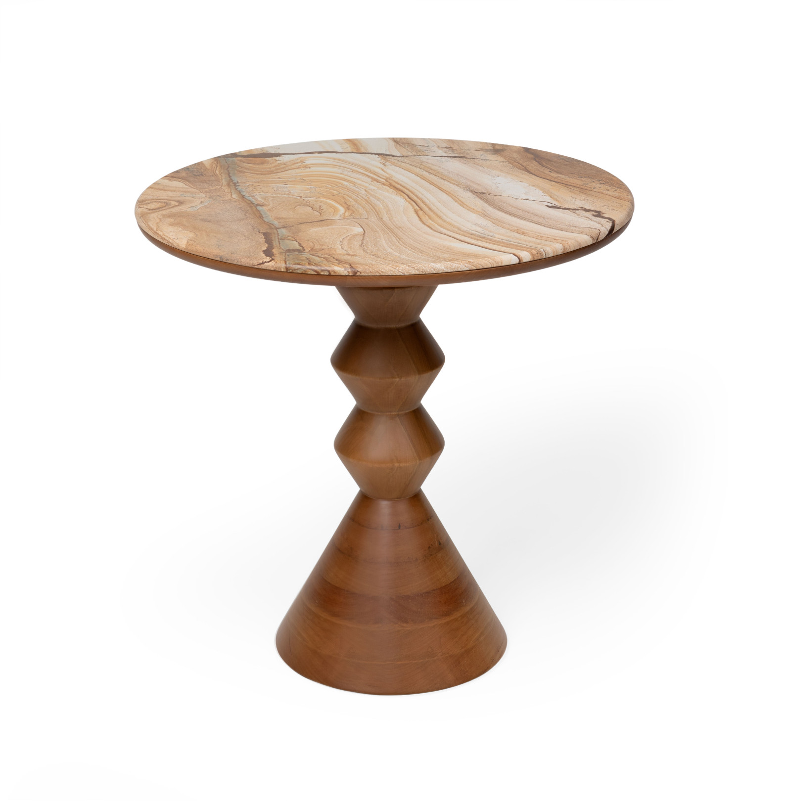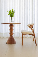 Produced in solid wood or lacquered MDF, the Maria side table combines classic references with contemporary aesthetics. Its segmented base, with pronounced edges, follows a striking geometric line that enhances the volume of the piece. The generously sized top offers practicality and can include a natural stone detail, adding sophistication. With a versatile height, it works both as a coffee table and as an additional support element in different compositions.