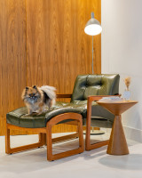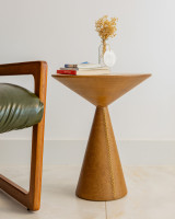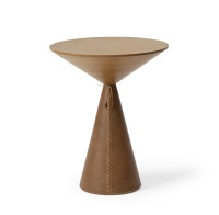 Inspired by the iconic wide–brim hats and leather overcoats that define Mexican style, the Mexicana side table is a piece of balance and elegance. Its conical base, wrapped in reconstituted leather, is available in black or coffee tones. The top, produced in solid wood or lacquered MDF, brings a sophisticated and contemporary touch to any environment.