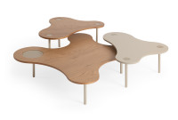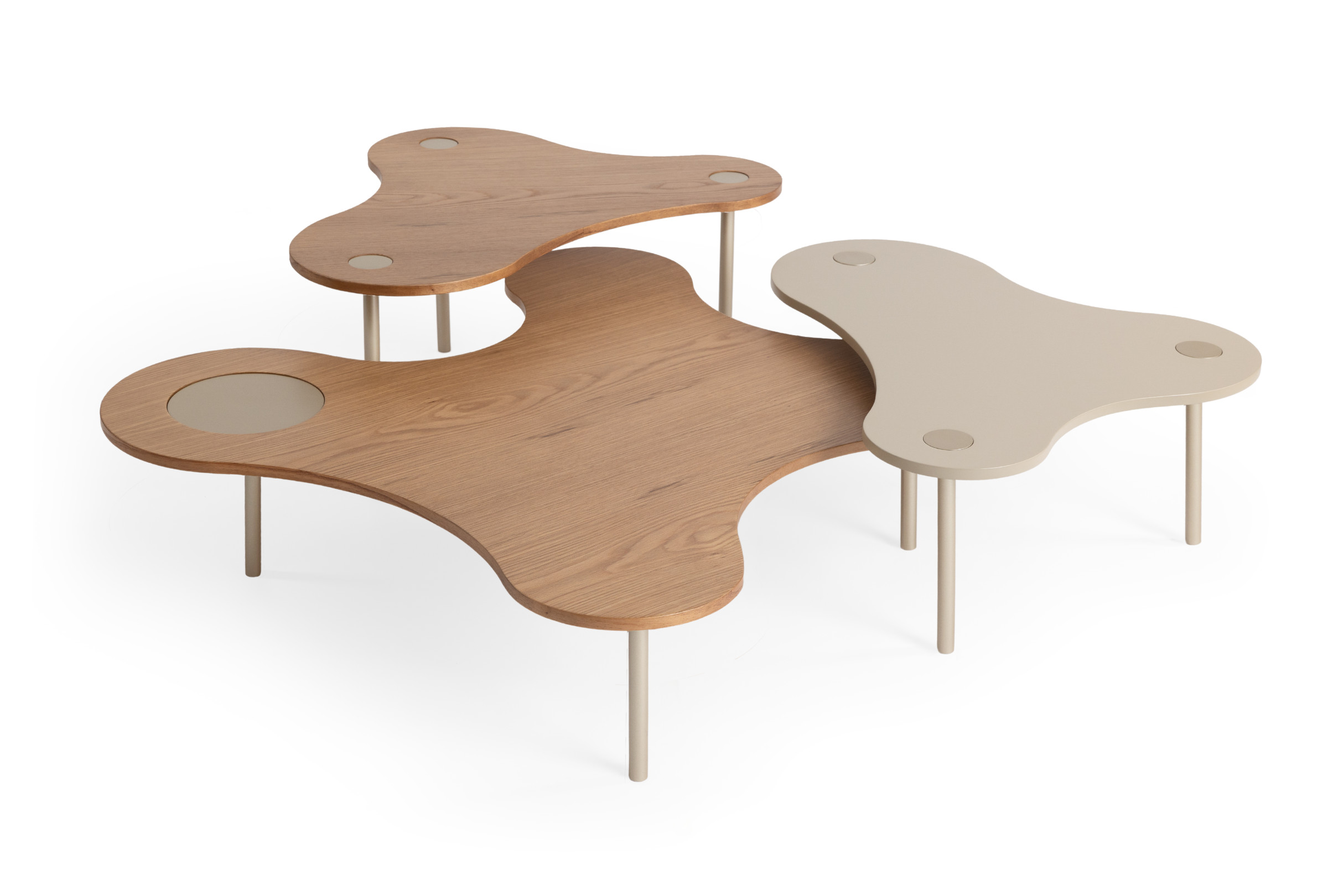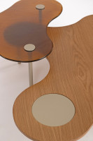 With a fully organic design, the Pampulha coffee table is crafted in MDF with natural wood veneer or lacquered finish, and its legs are produced in metal. The tabletop includes metal details. In the smaller version, there is also the option of producing it in fusion glass.