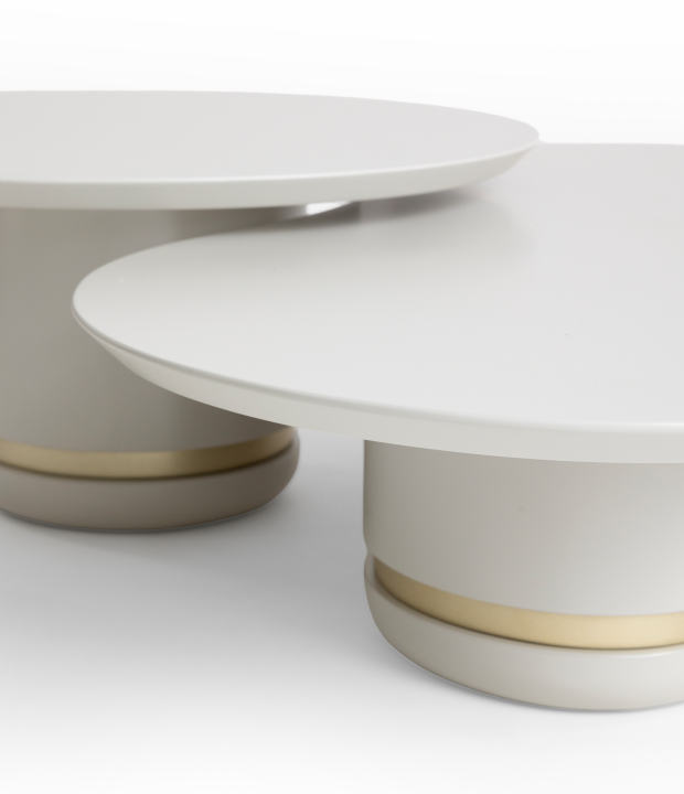 The Plure coffee table stands out for its construction in MDF finished with natural wood veneer or lacquer. Its distinguishing feature is a low-relief detail in metallic tones, adding a refined touch. It is available in two versions: one with a round top and base, and another with an organic shape.