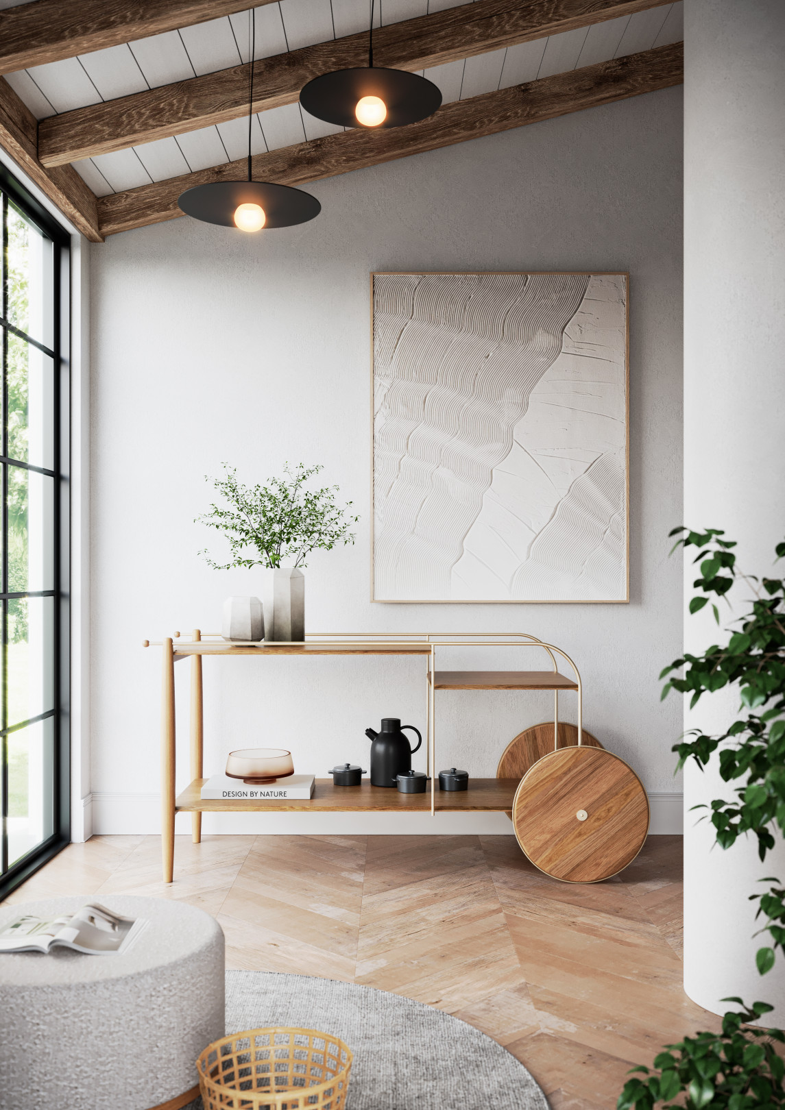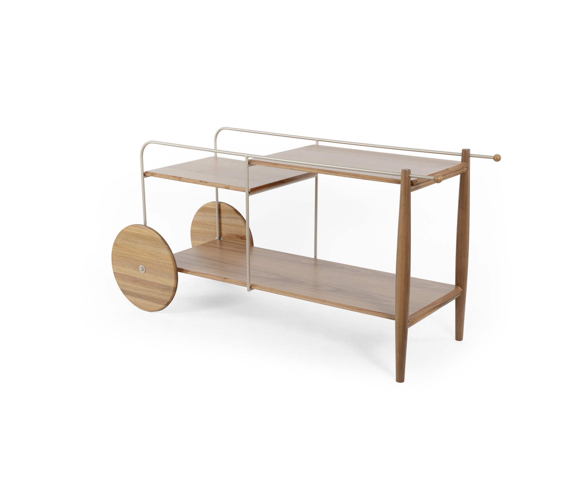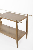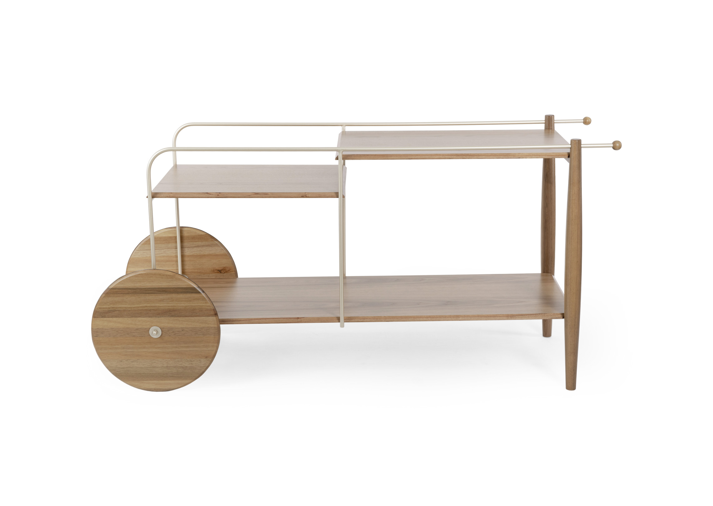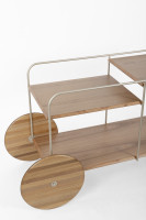 The Salinas bar features MDF tops finished with natural wood veneer, solid wood wheels and legs, and a carbon steel structure.