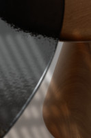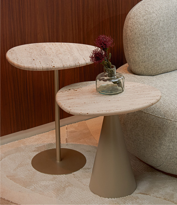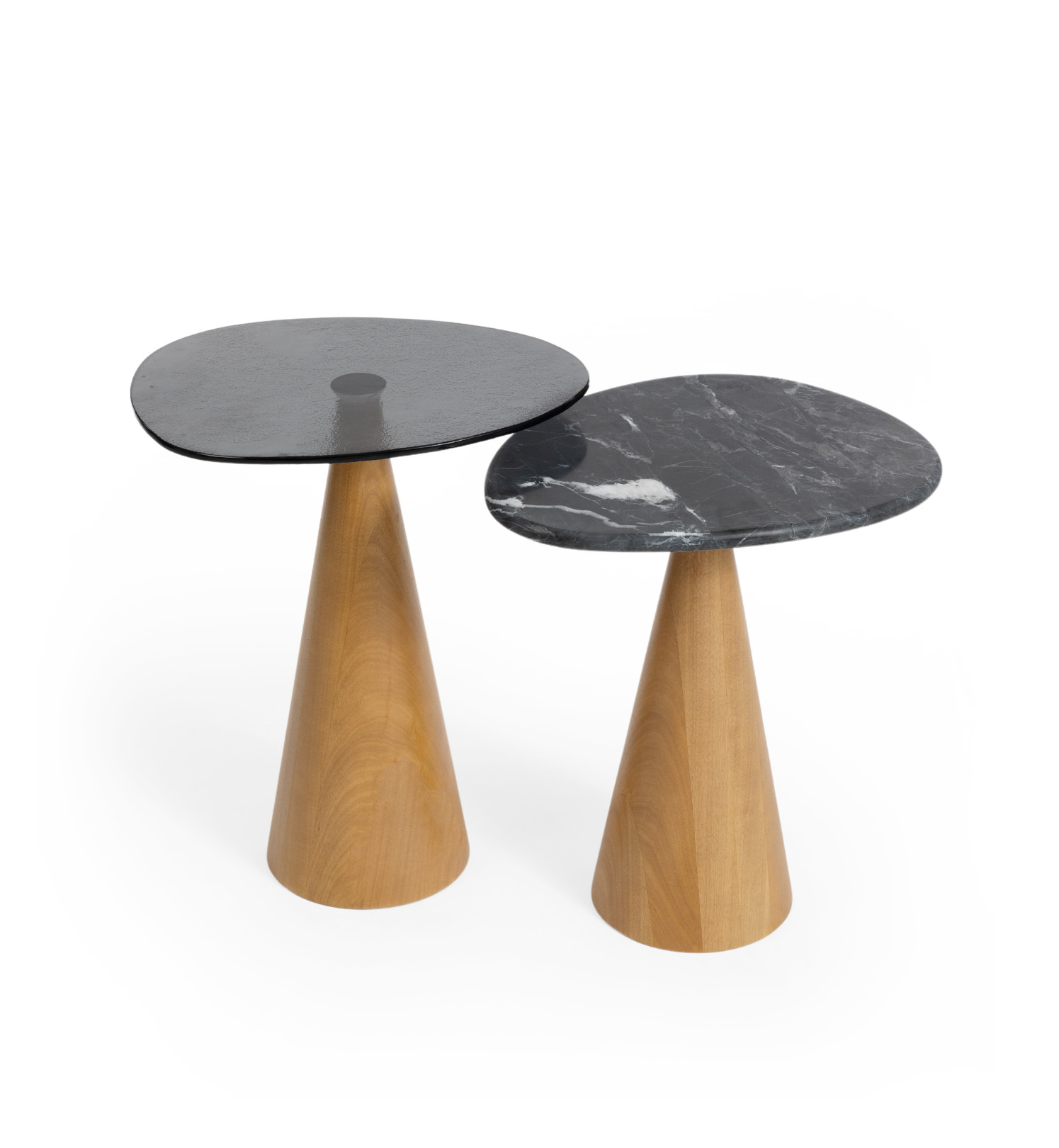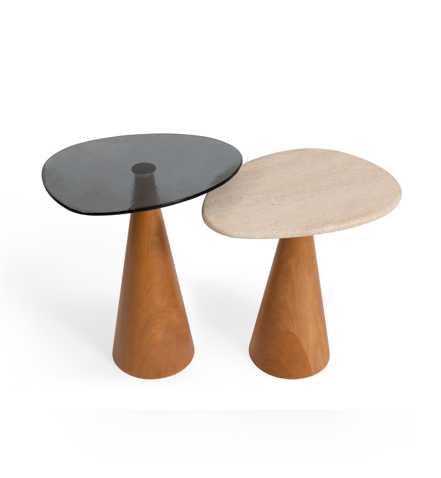 With a cone-shaped base, the Semente set also features an organic top, which can be crafted in wood, lacquer, or stone. The base is produced in solid wood or lacquered MDF.