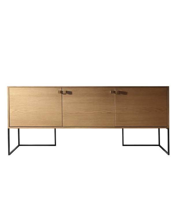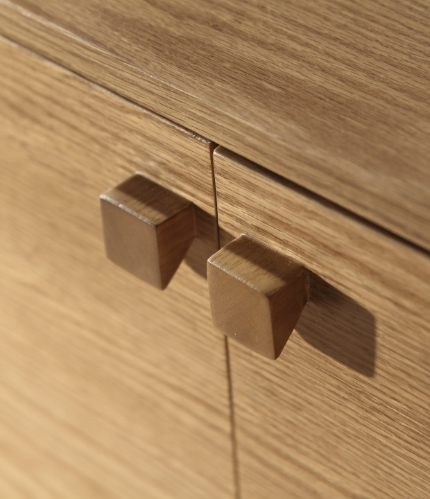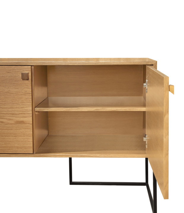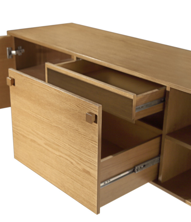 The Tetris buffet is crafted in MDF veneered with natural wood or finished in lacquer. It features metal legs, solid wood handles, doors with slow-motion hinges (soft-close system), and drawers with telescopic slides. It is available in three size options: the smallest includes two doors and two internal drawers, while the larger versions include two doors, one external drawer, and one internal drawer.