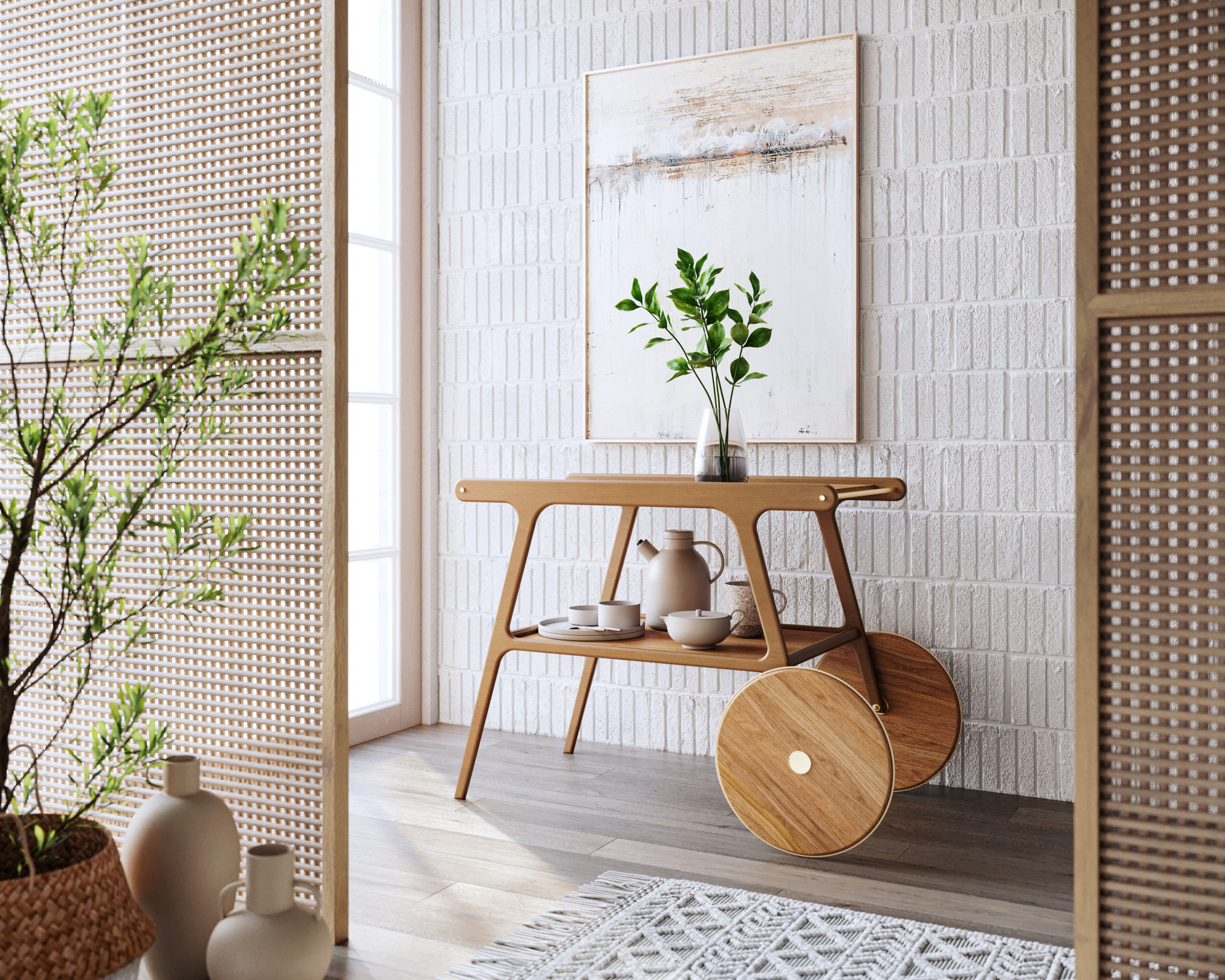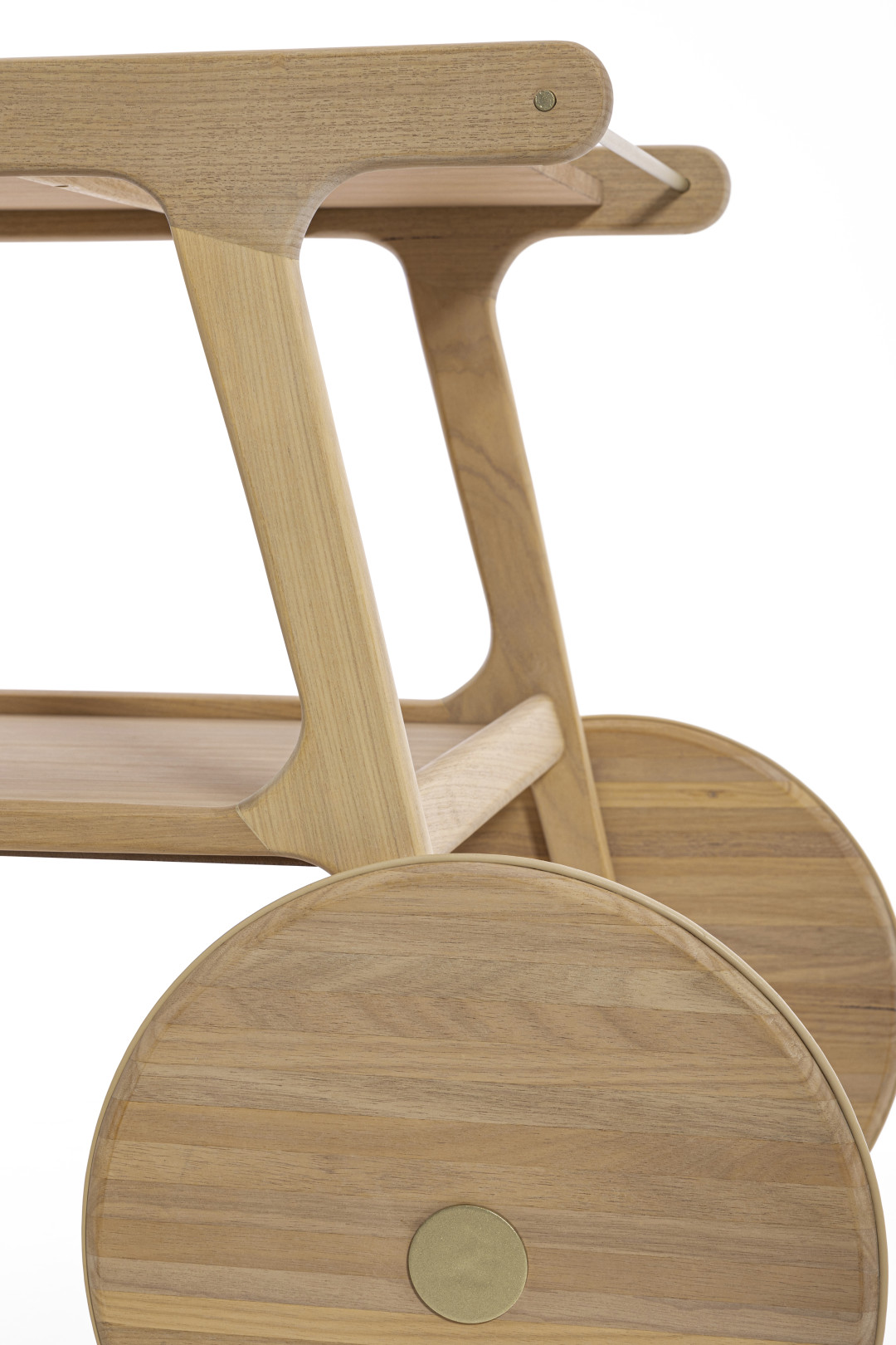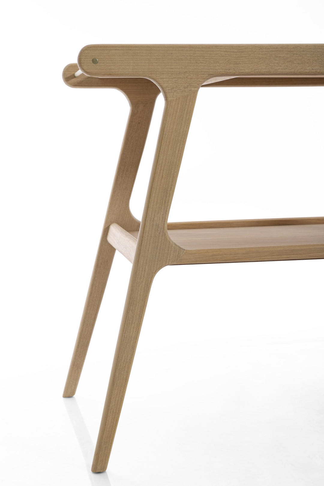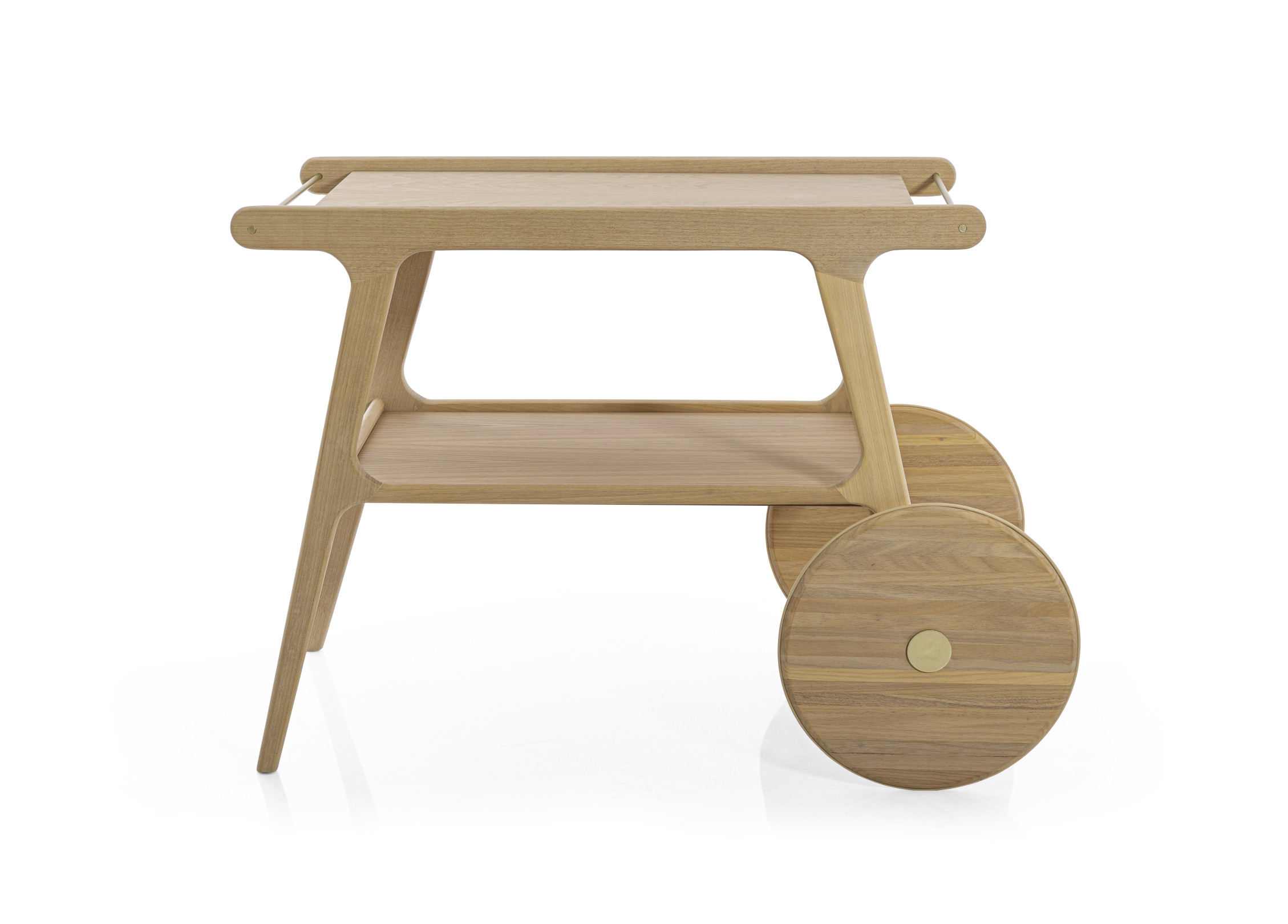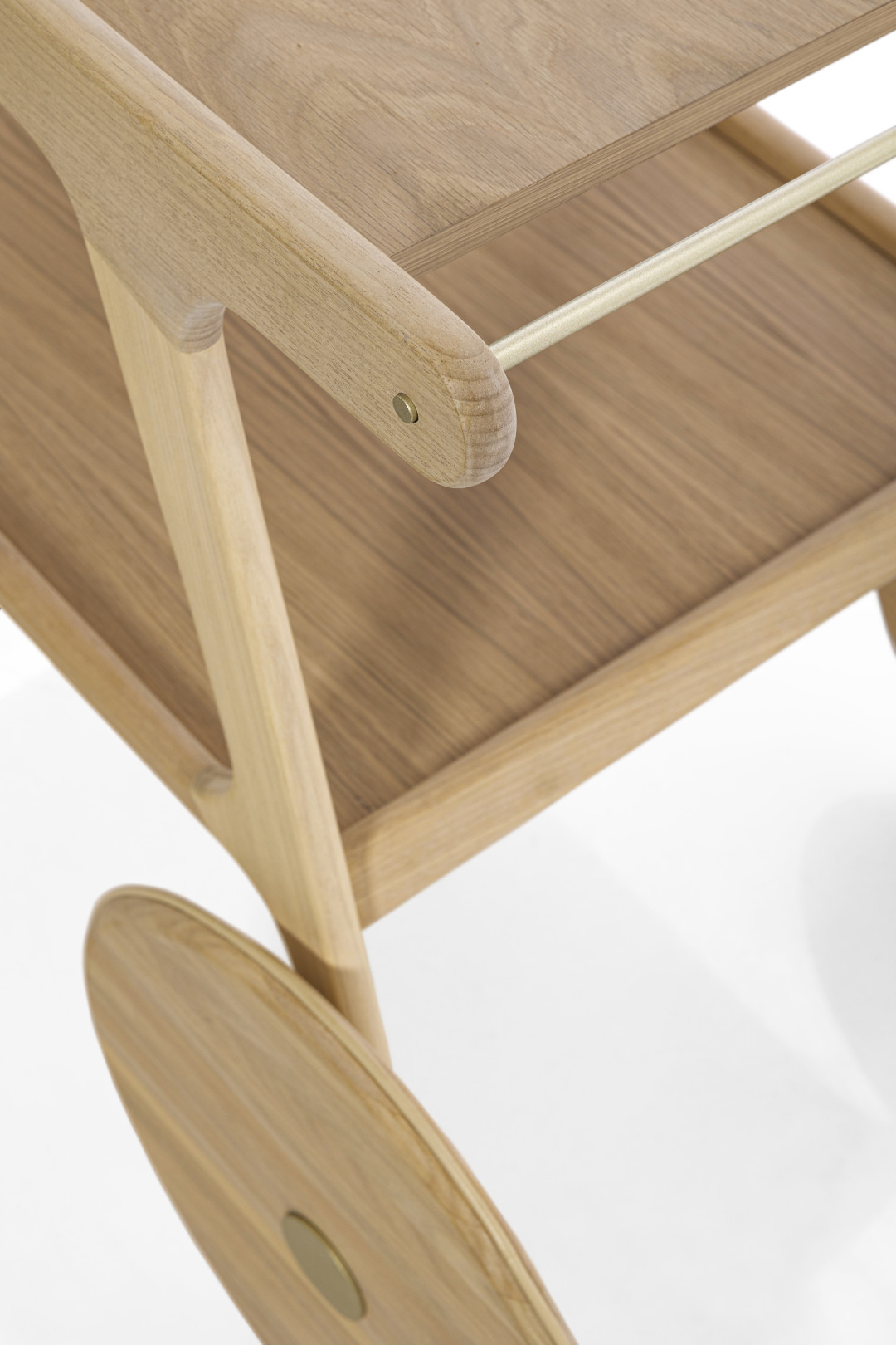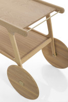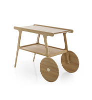 Fluid lines, soft curves, and the strong presence of solid wood are the defining characteristics of the Torii tea cart. Inspired by Japanese culture and, as its name suggests, its form is based on the gates found in traditional shrines. It features MDF tops finished with natural wood veneer and carbon steel rods that contrast with the wood and assist in handling the piece, remaining true to its essence: a functional support for everyday serving.
