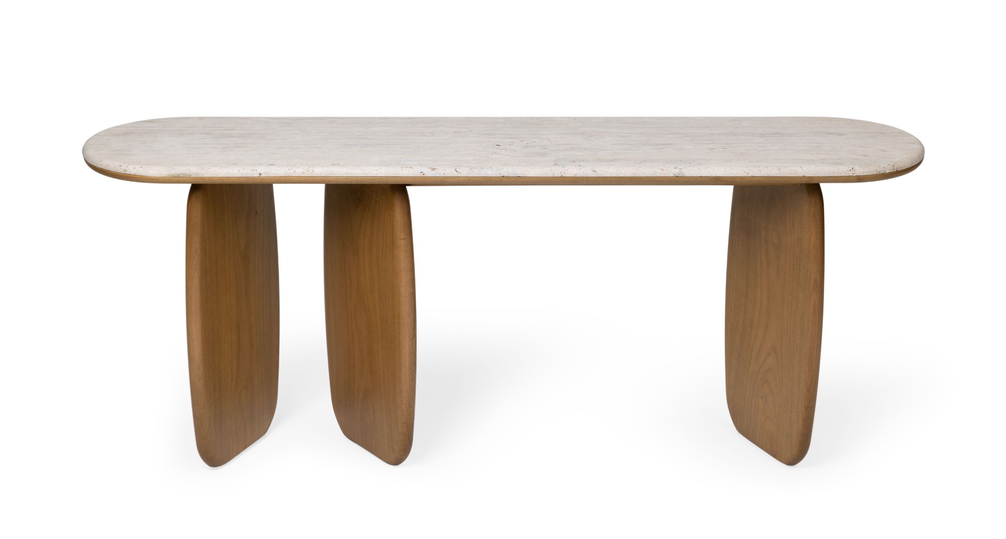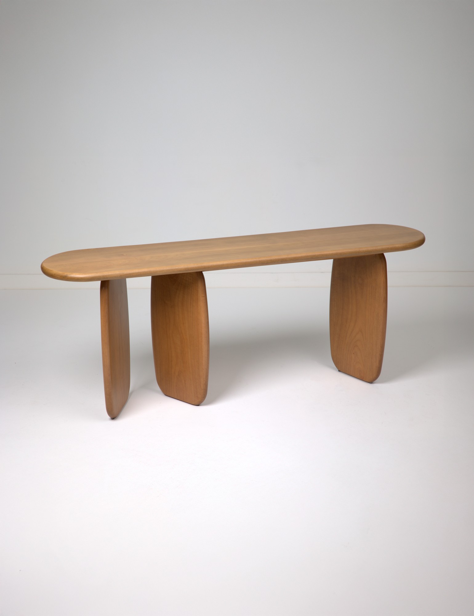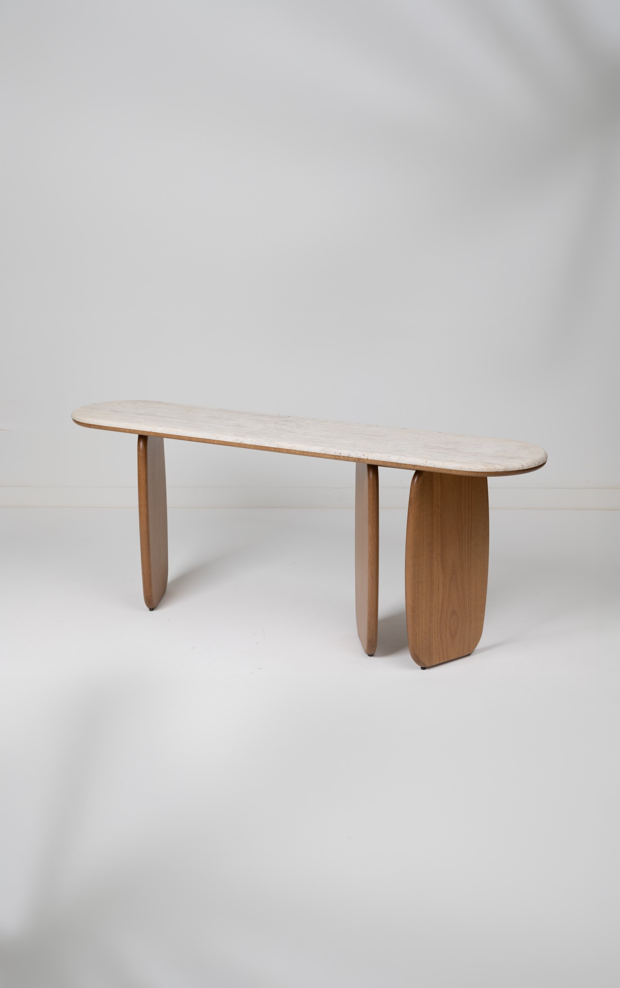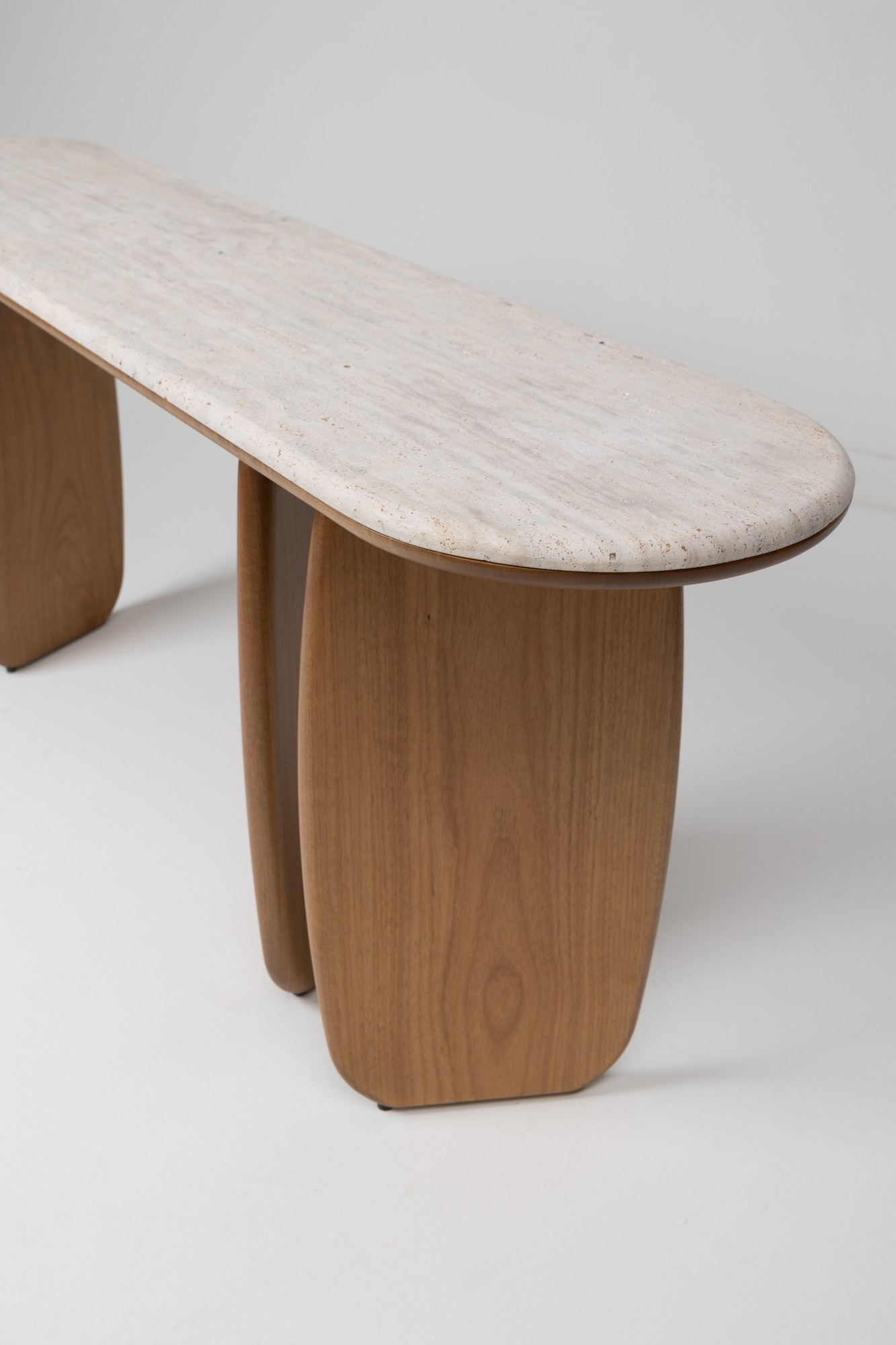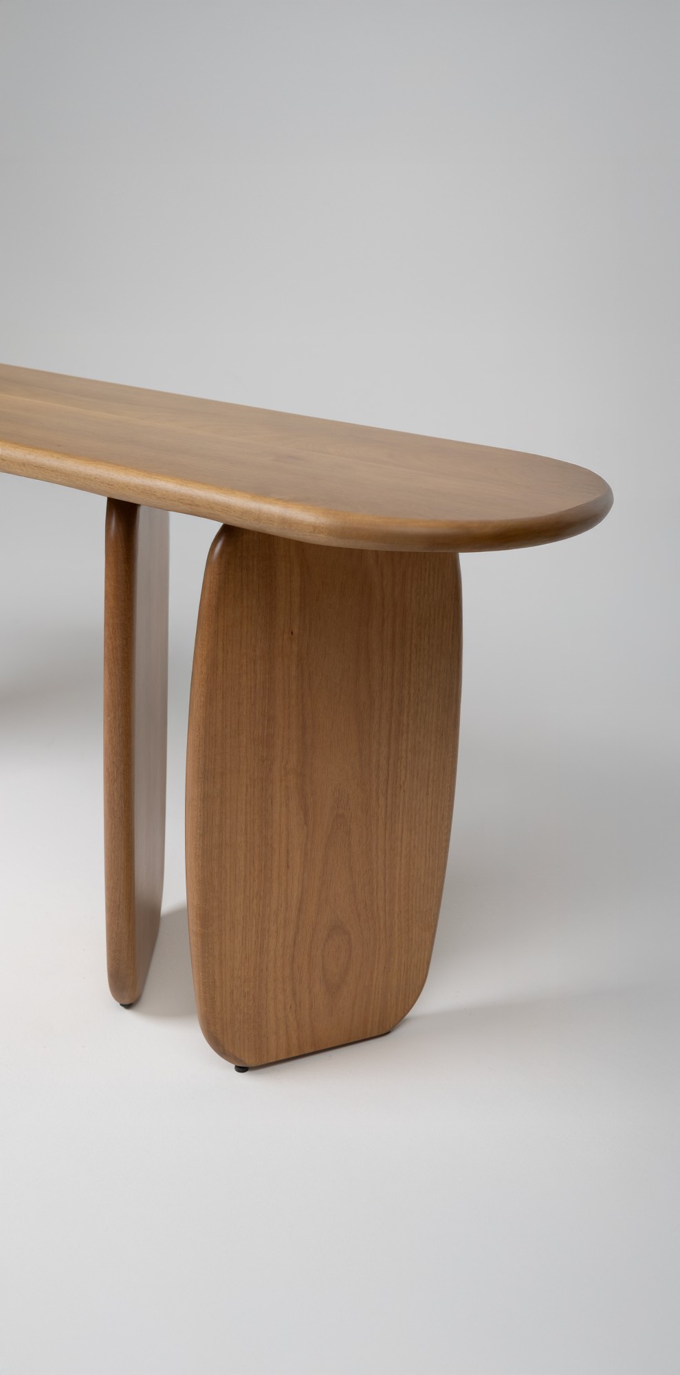 O Aparador Elos é inspirado na ideia de continuidade, com formas que sugerem movimento e transformação. Sua estrutura pode ser produzida em madeira maciça ou MDF laqueado. As bases arredondadas sustentam o tampo, que possui detalhe disponível em pedra natural.