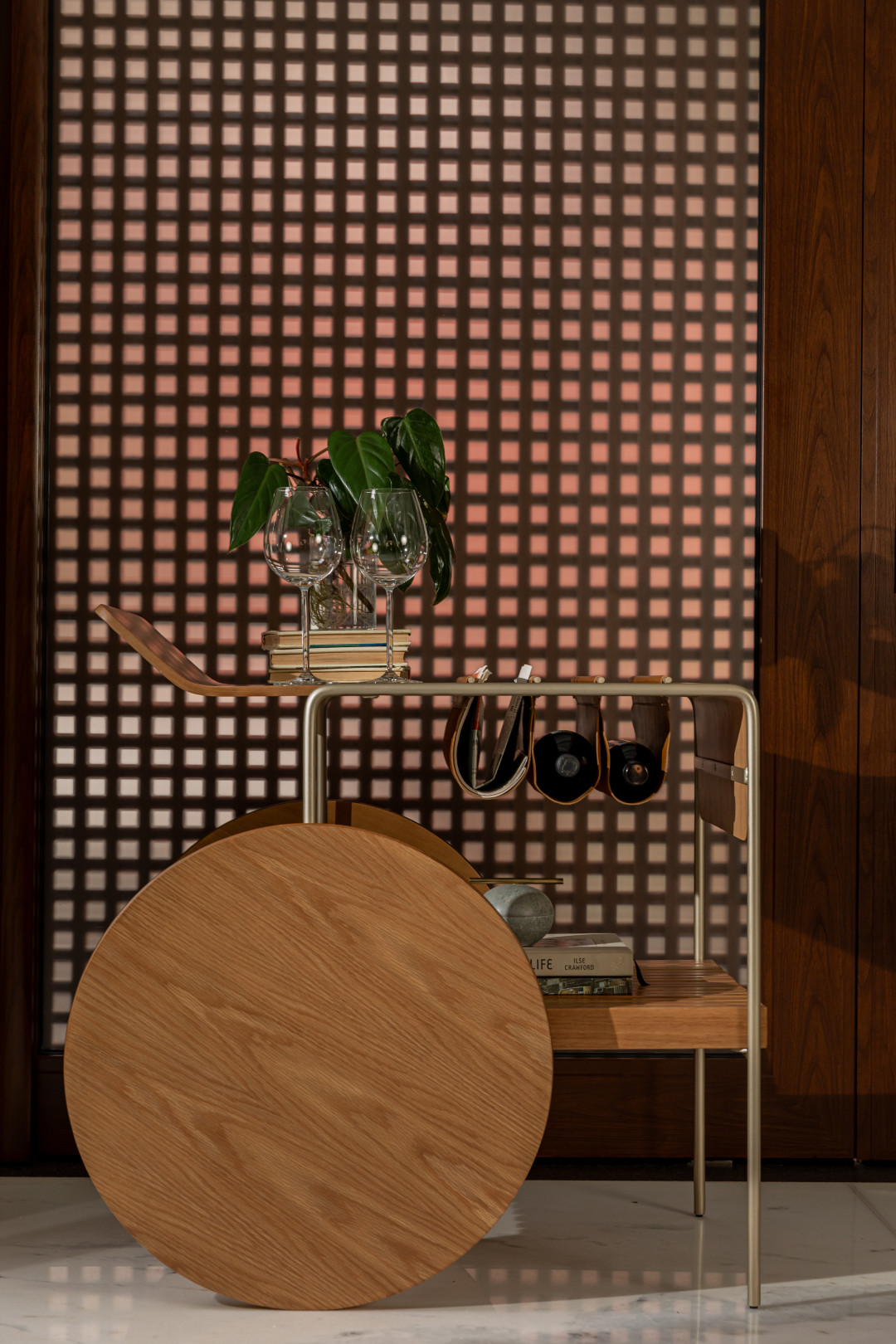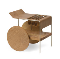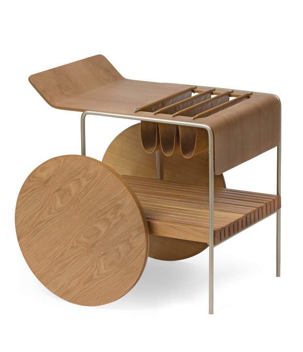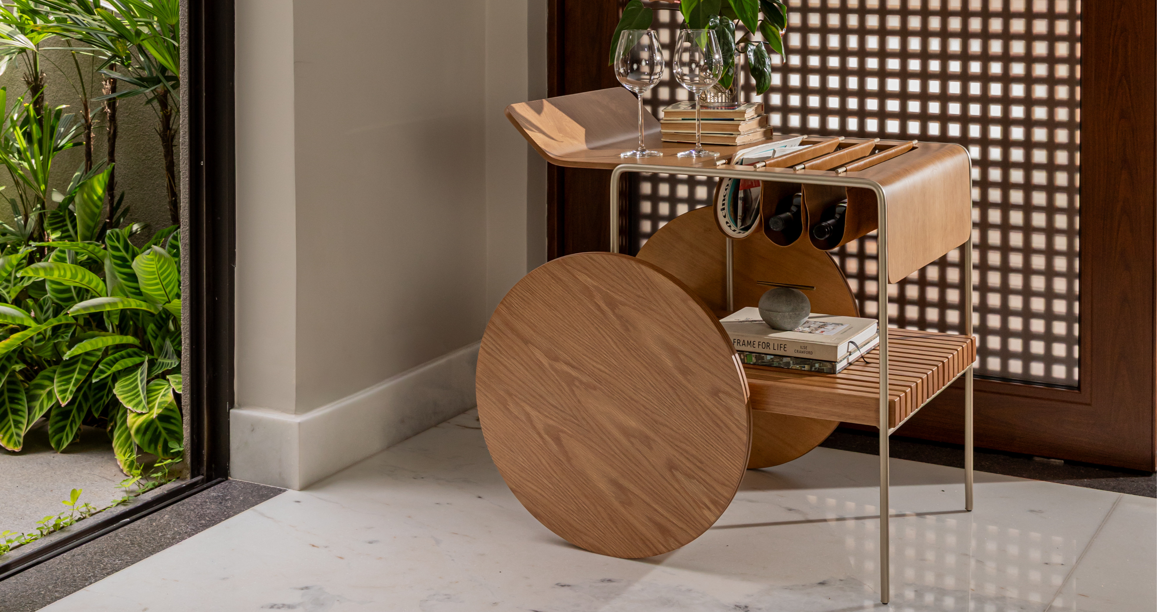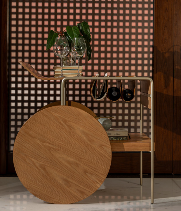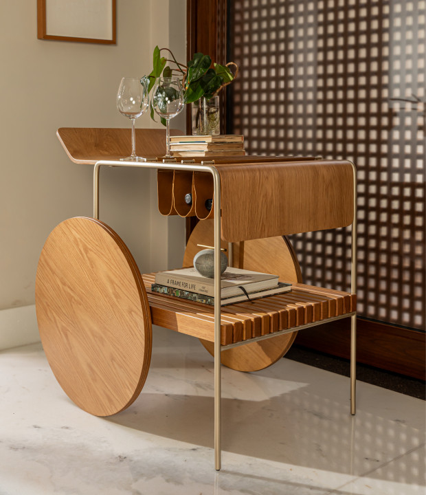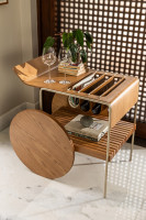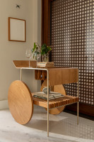 Bar com tampo e rodas em MDF laminado. Estrutura em metal laqueado e suporte para vinhos em couro. As rodas possuem envoltório em recouro.