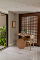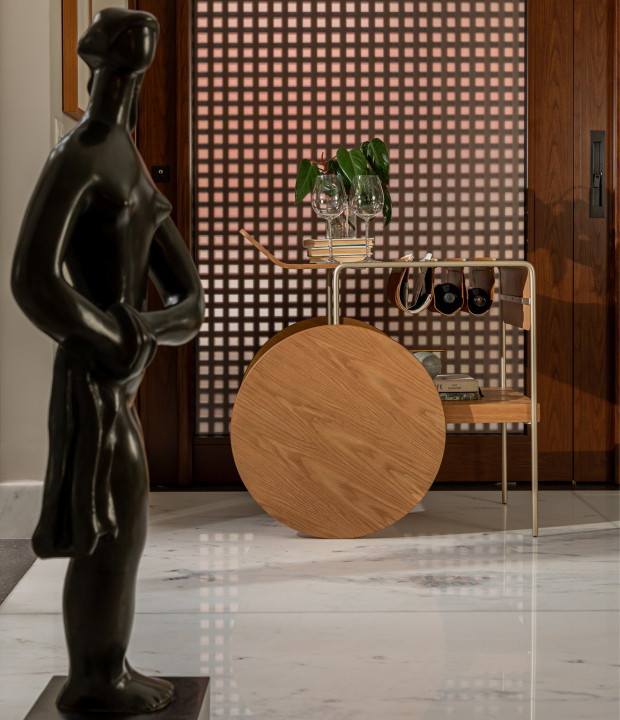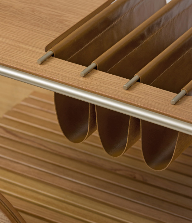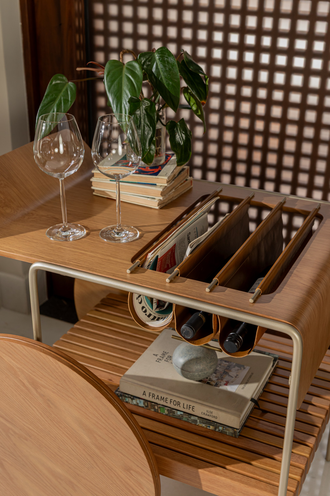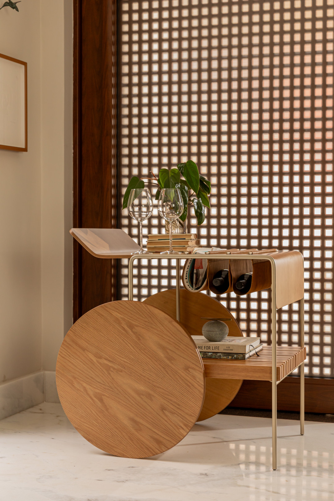 Bar com tampo e rodas em MDF laminado. Estrutura em metal laqueado e suporte para vinhos em couro. As rodas possuem envoltório em recouro.
