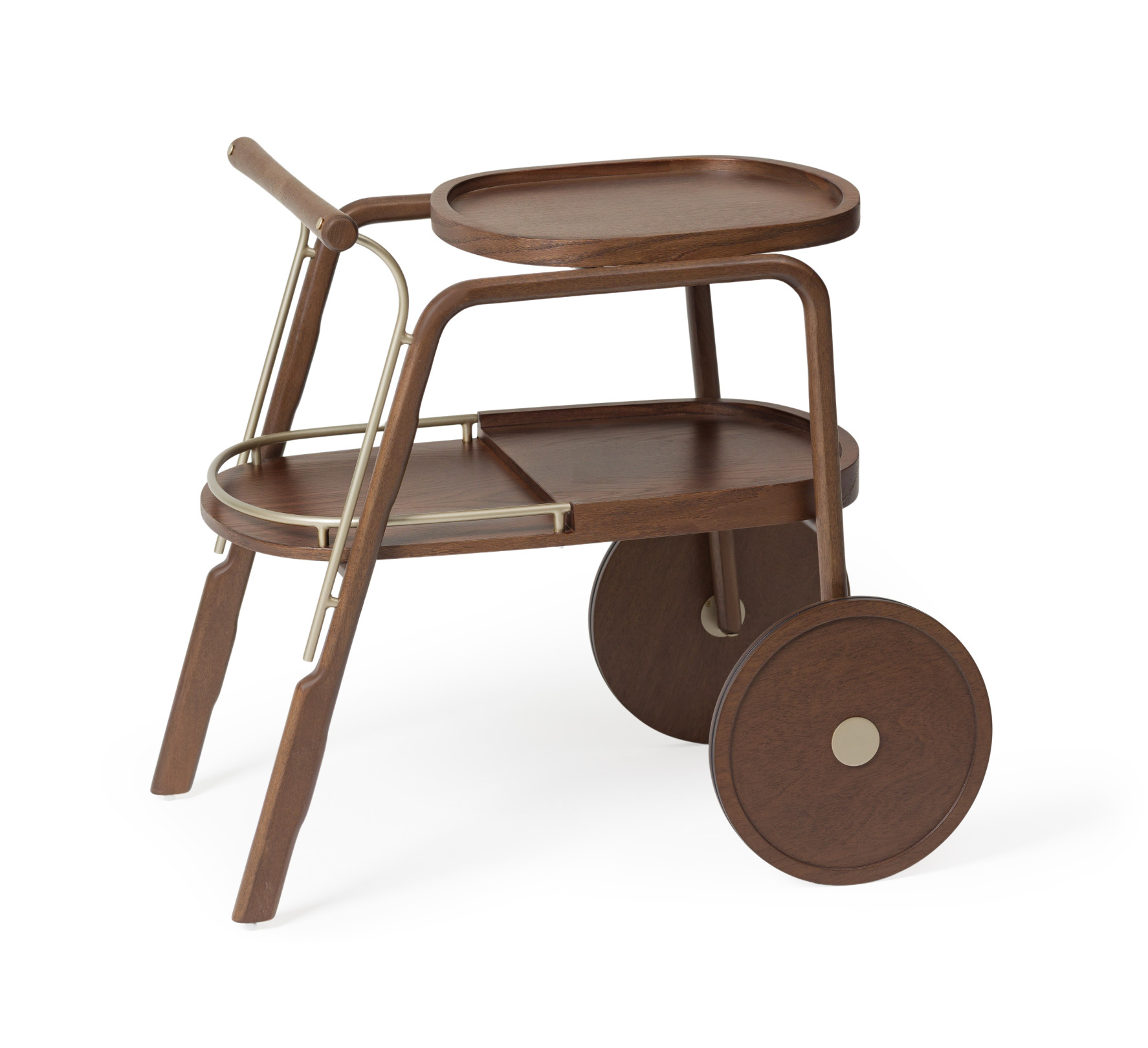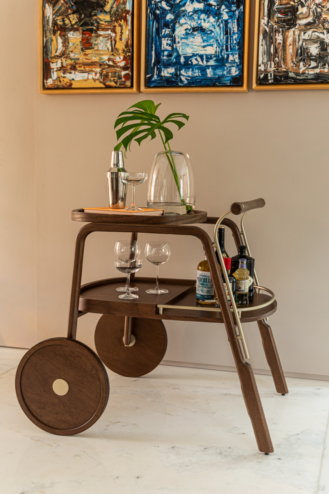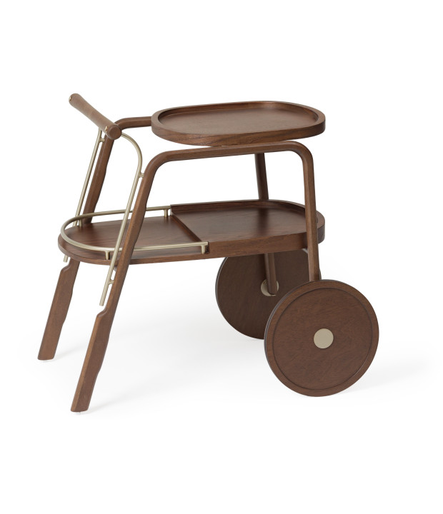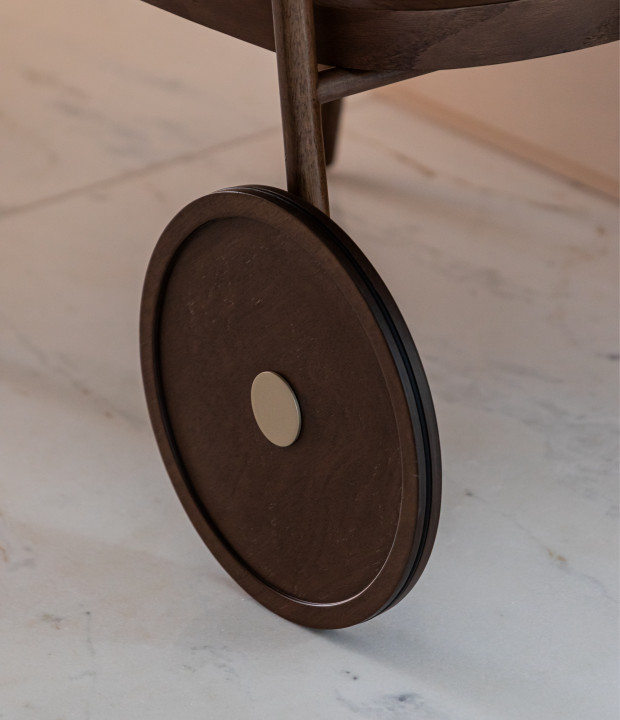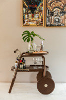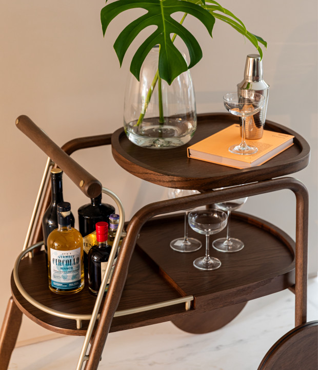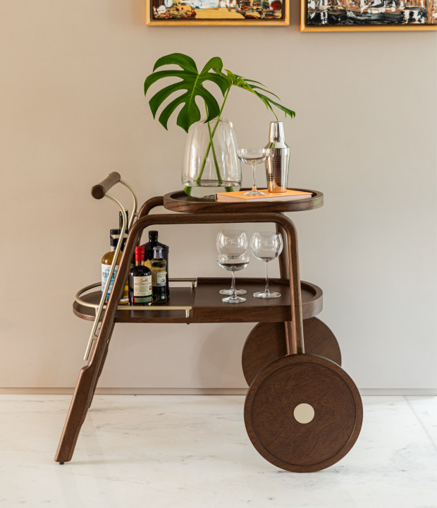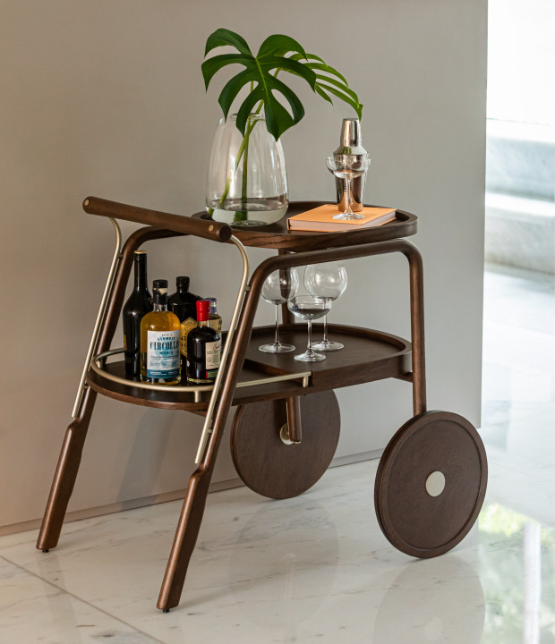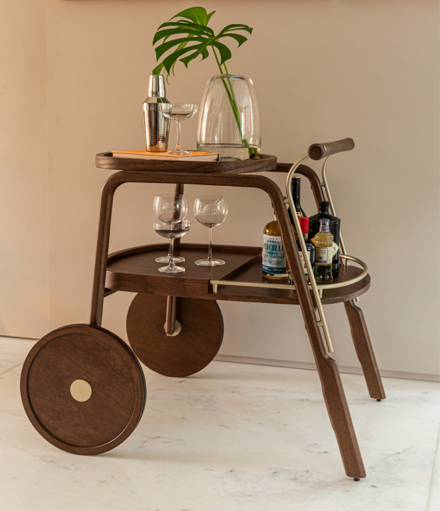 Bar em madeira maciça, bandejas em MDF laminado e detalhes em metal laqueado.