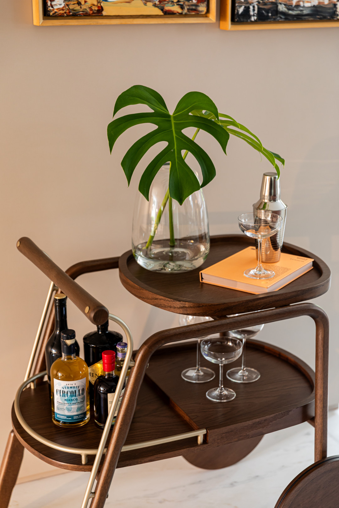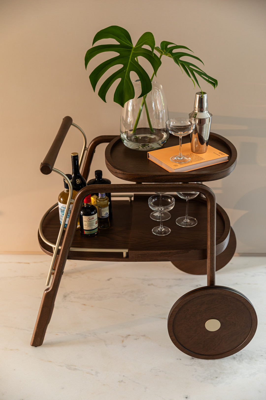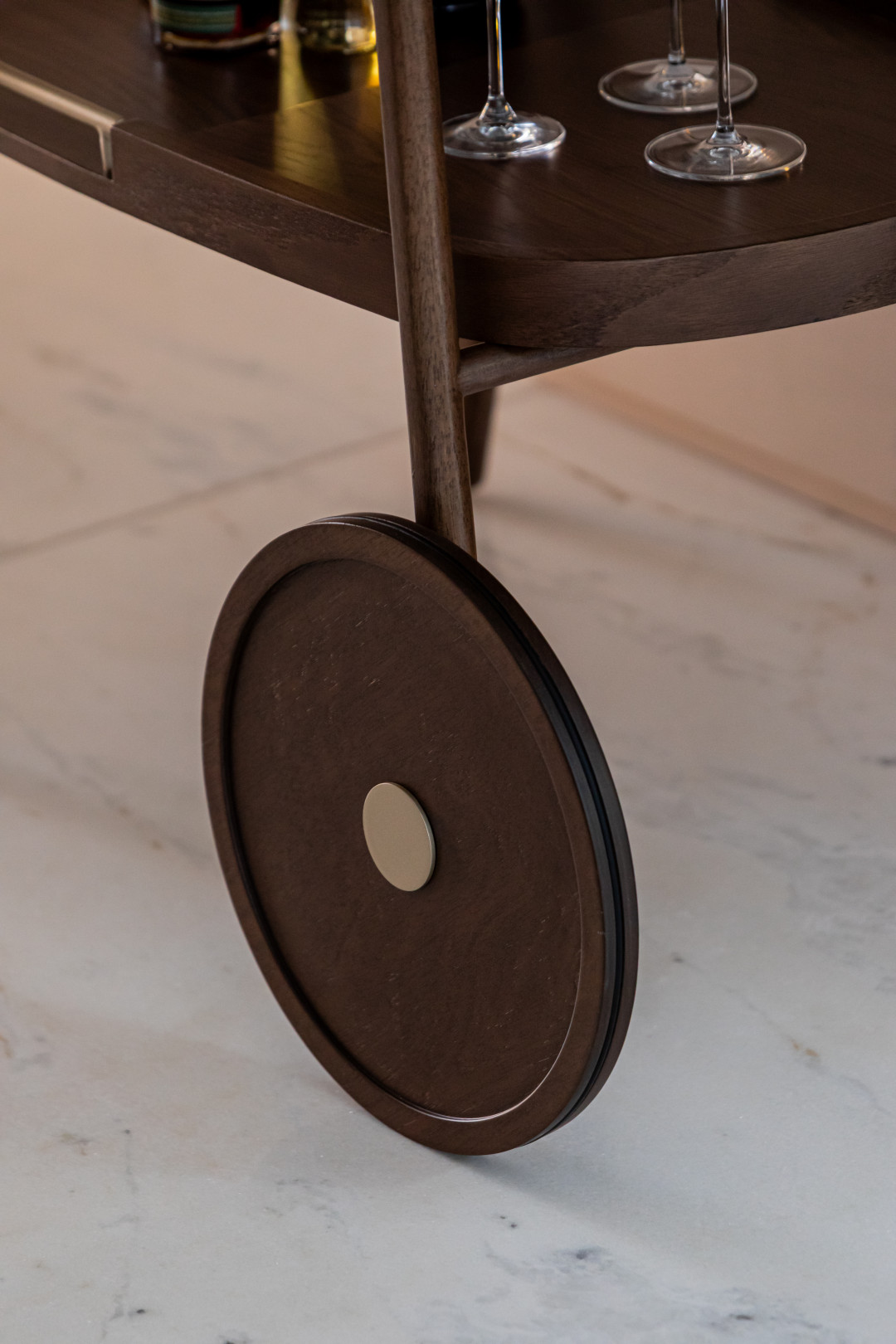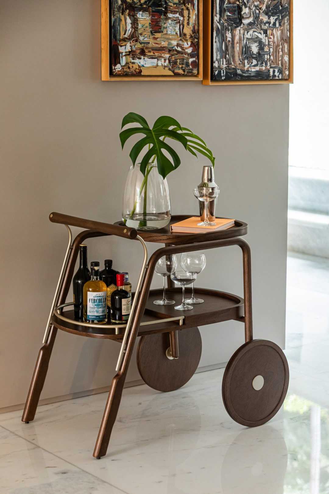 Bar em madeira maciça, bandejas em MDF laminado e detalhes em metal laqueado.