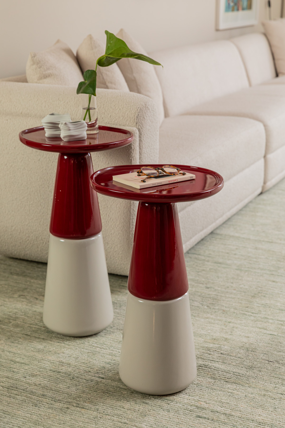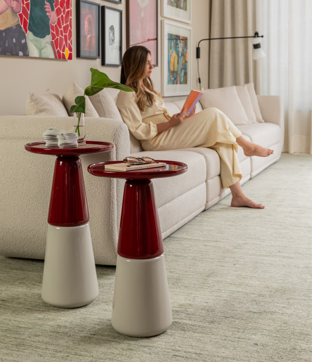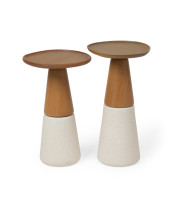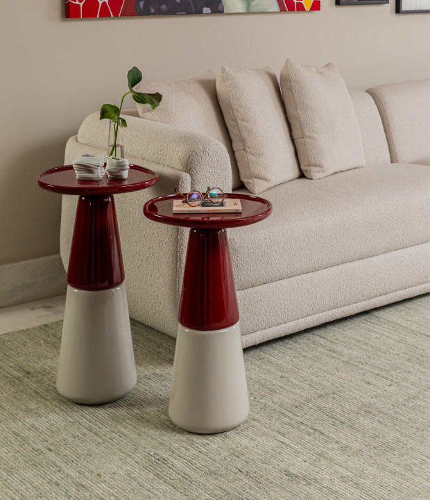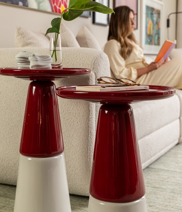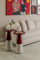 Mesa com tampo e parte superior da base em madeira maciça, MDF laqueado ou texturizado, parte inferior da base também em madeira maciça, MDF laqueado ou texturizado.