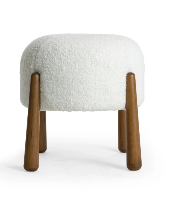 O puff Aisha possui assento com espuma D28 e pés em madeira maciça.