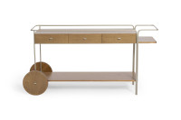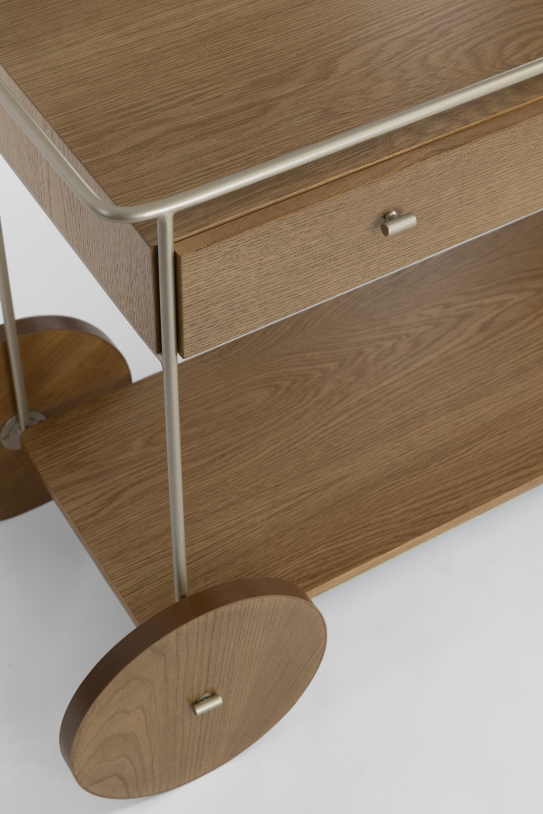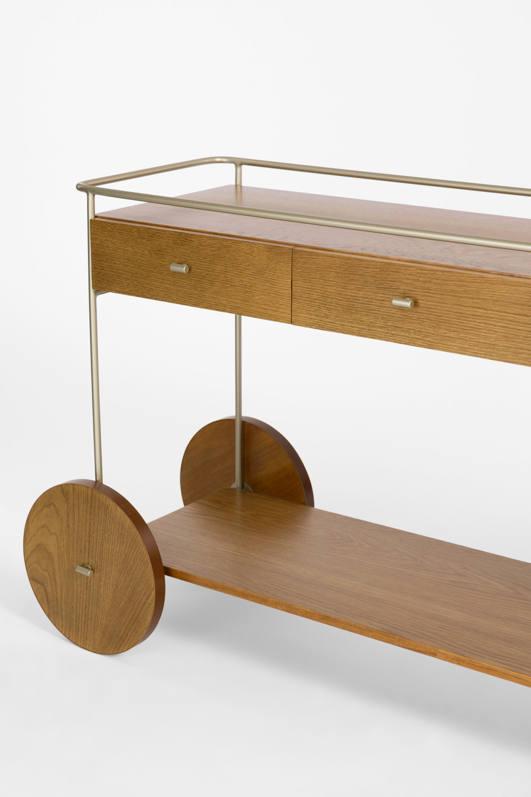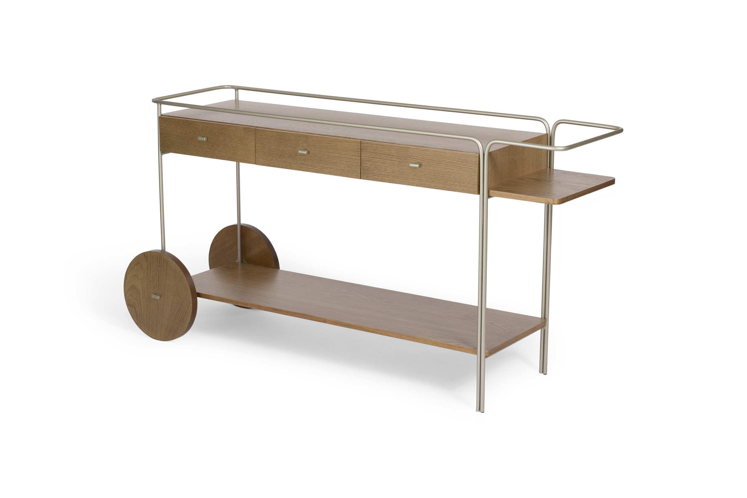 Criado com a intenção de gerar contraste na utilização de madeira e metal, o aparador Cargo promove união entre a sutileza de seus perfis em aço carbono, envoltos ao gaveteiro e a praticidade da roda giratória de sua base. Feito em MDF laqueado ou revestido com lâmina natural de madeira, com puxadores de aço, rodas com envoltório de couro e gavetas com corrediças telescópicas.
