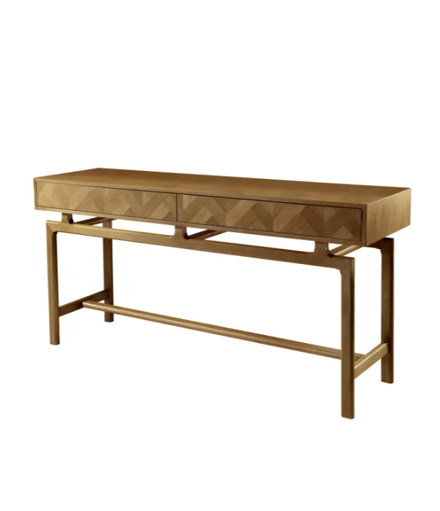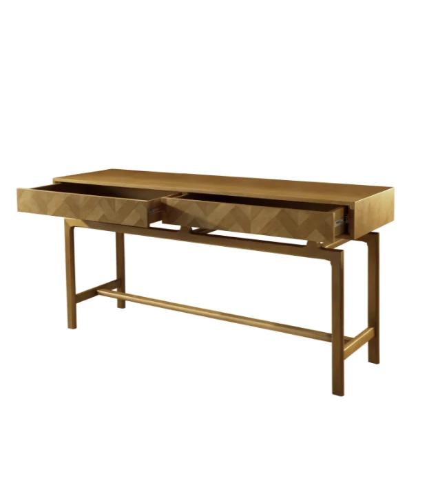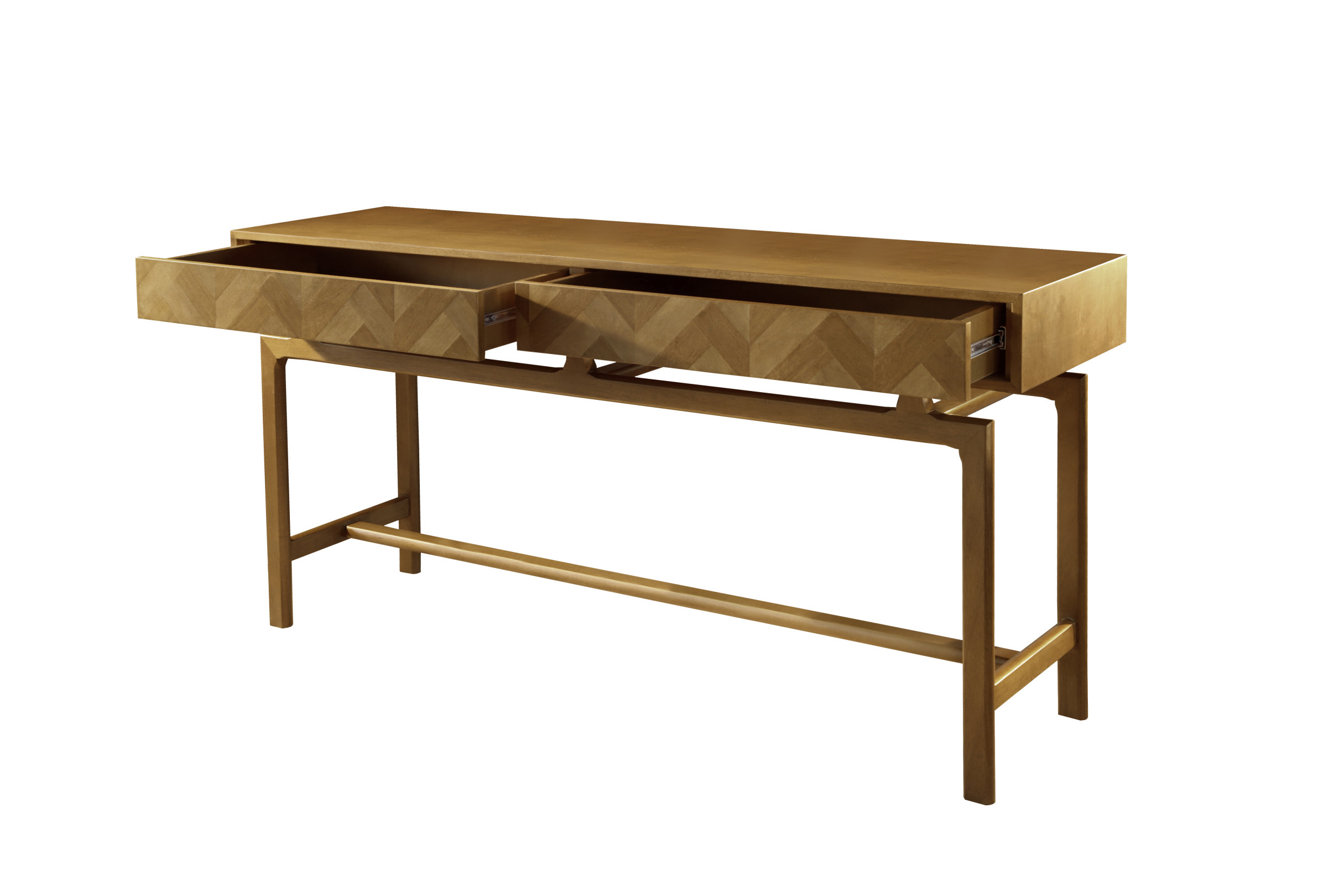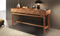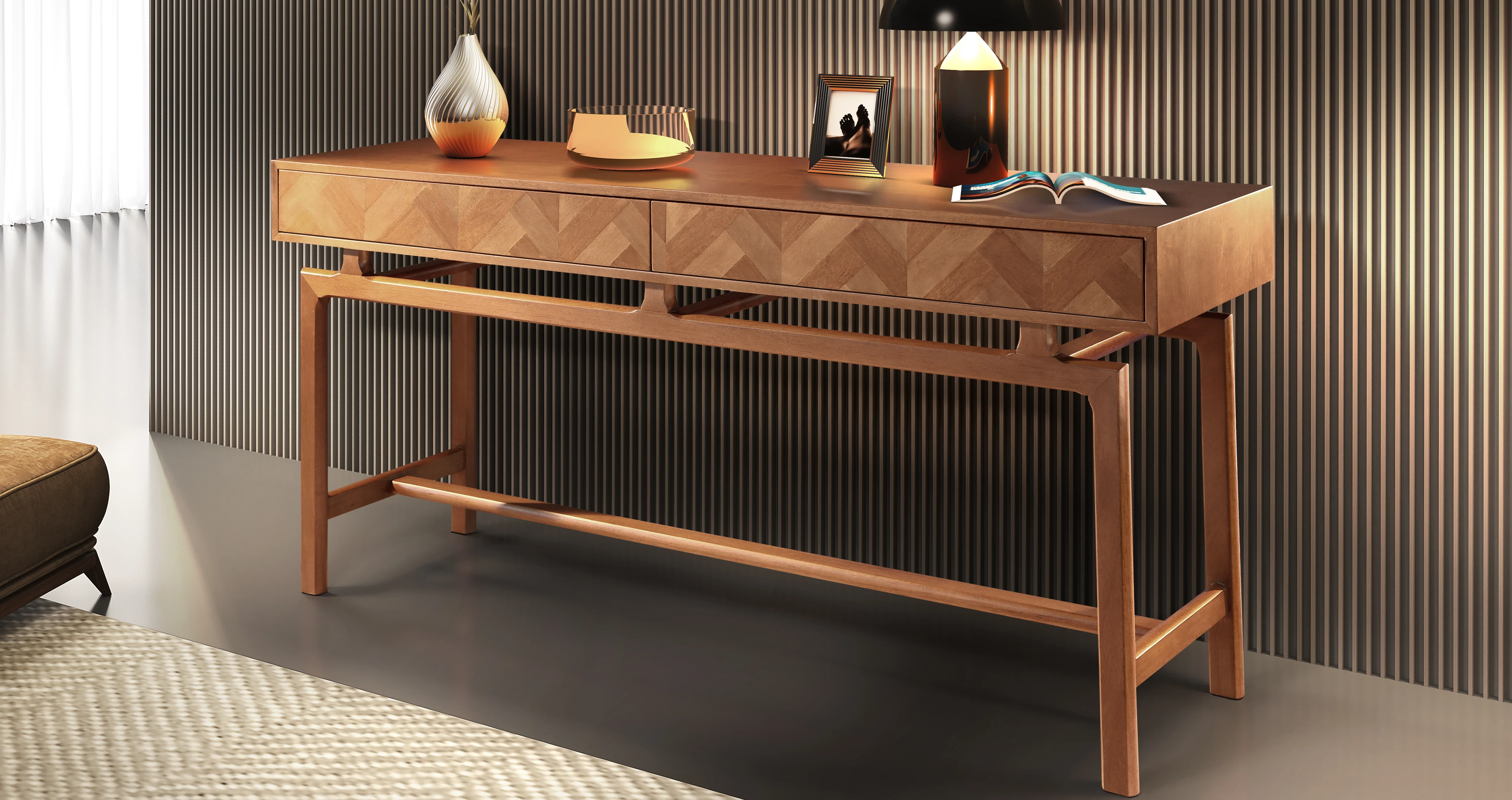 O aparador Chevron dispõe de gavetas em marchetaria com corrediças leve toque (push open), estrutura de MDF revestido com lâmina natural de madeira e pés em madeira maciça.