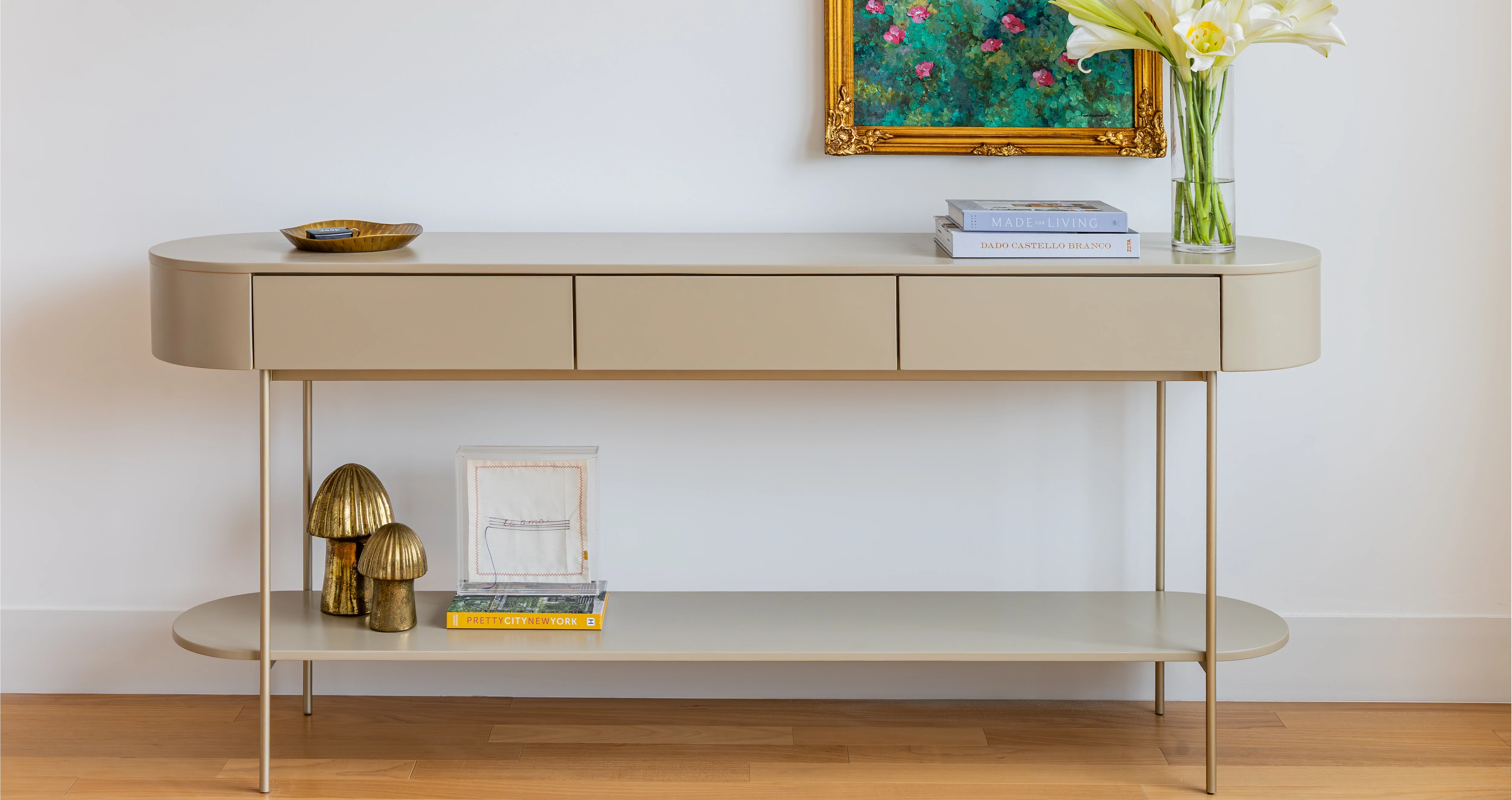 Com estrutura metálica laqueada, o aparador Gal possui gaveteiro e prateleiras em MDF revestido em lâmina natural de madeira ou acabamento laqueado. Disponível em duas versões de tamanho, uma com três gavetas e outra com duas gavetas. Ambos os modelos apresentam corrediças telescópicas.