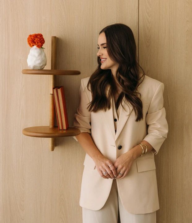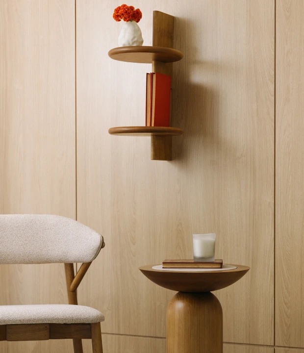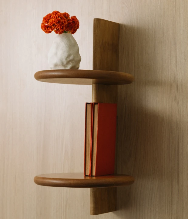 O apoio de parede Luna tem formato circular e instalação na parede, unindo forma e função com equilíbrio. Produzida em madeira maciça ou MDF laqueado, oferece apoio leve e discreto, ideal para organizar sem interromper o fluxo do ambiente.