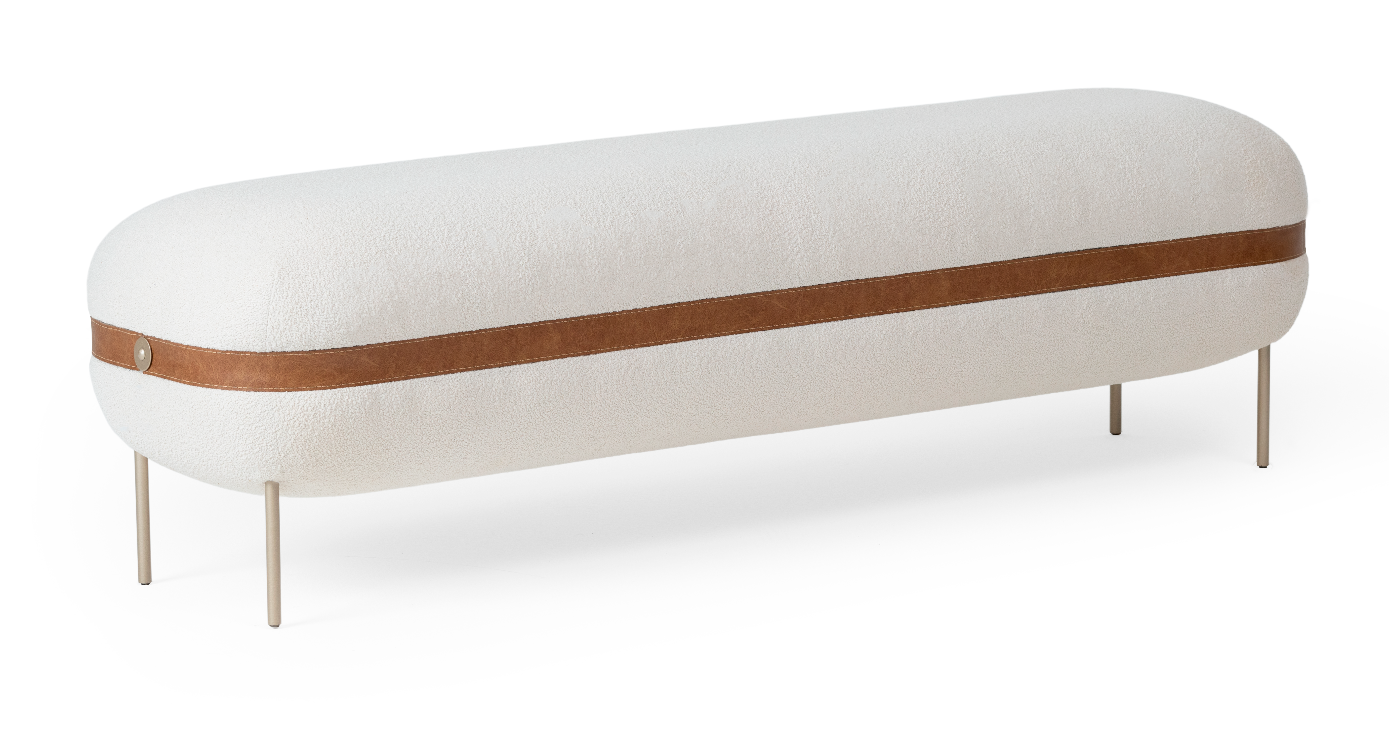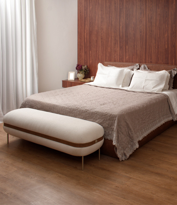 Assim como a música blues, o banco e o puff Blues buscam trazer uma sensação de aconchego e harmonia, tornando qualquer espaço mais convidativo. São revestidos com espuma, garantindo conforto em seu uso, o detalhe em recouro acrescenta uma textura luxuosa, enquanto os pés metálicos laqueados garantem um toque de modernidade.