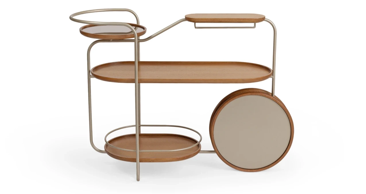 O carrinho bar Dintorno é um móvel compacto e prático, sua base é produzida em metal e suas prateleiras em madeira maciça ou laqueada, há também um espelho bronze em sua prateleira superior. Com um design orgânico de linhas fluidas, destaca-se em ambientes estreitos como salas de jantar, salas de estar e escritórios. O nome "Dintorno" sugere contornos, refletindo-se no design que inclui prateleiras espaçosas, suporte invertido para taças e apoios superiores.