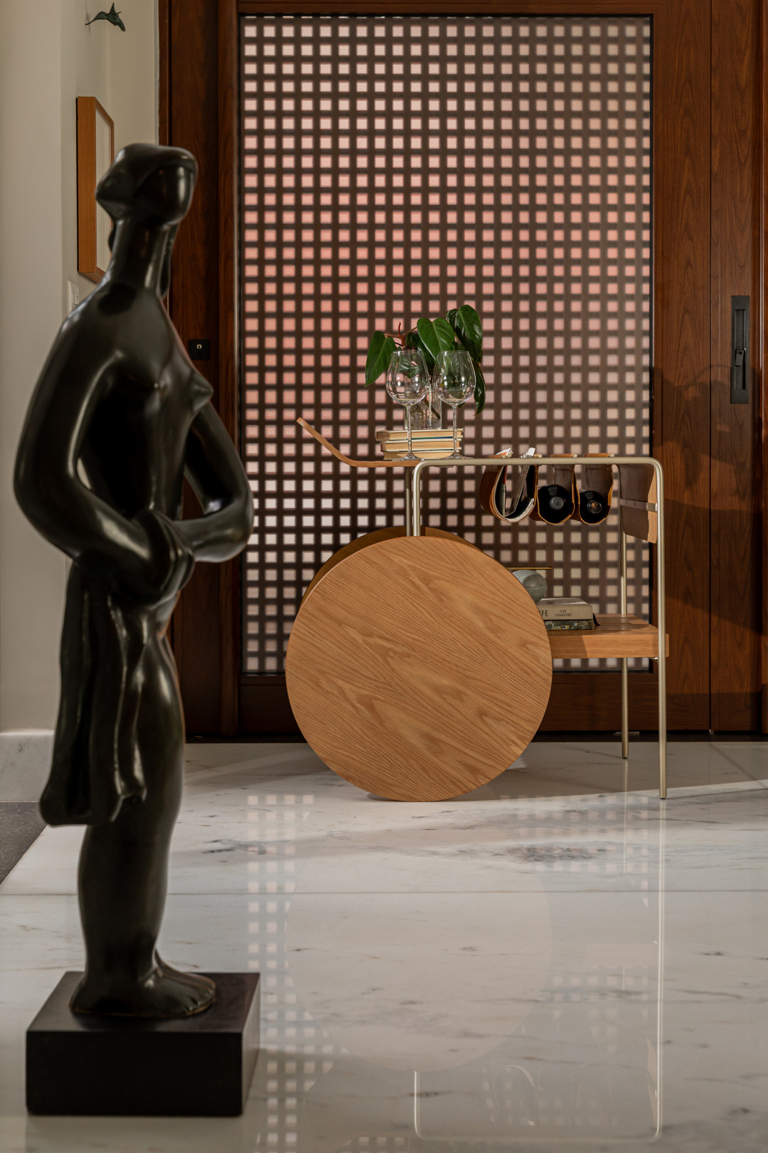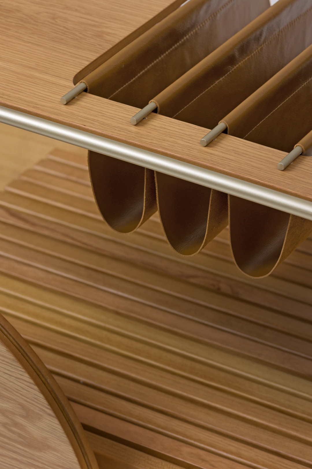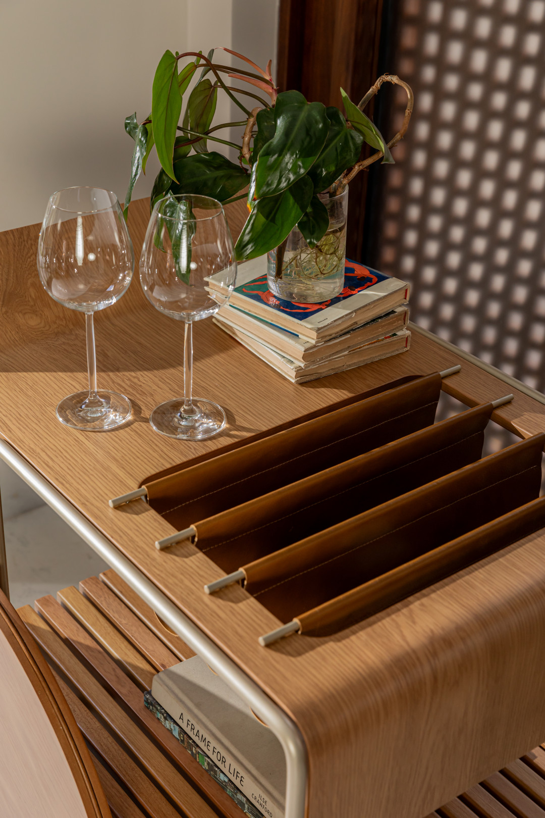 Bar com tampo e rodas em MDF laminado. Estrutura em metal laqueado e suporte para vinhos em couro. As rodas possuem envoltório em recouro.