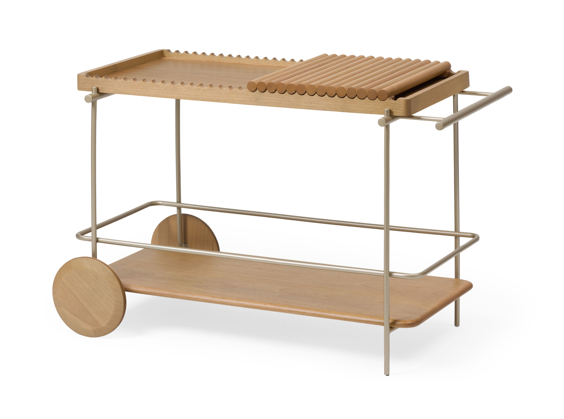 Bar com estrutura em metal laqueado. Tampo, prateleira, bandeja e rodas em madeira maciça com envoltório em recouro.