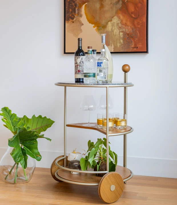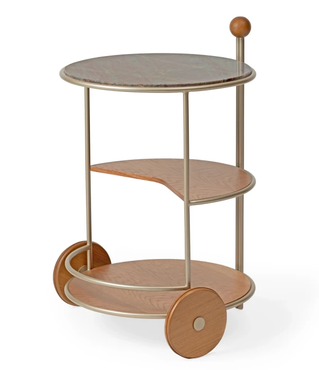 Inspirado no reino fungi, o bar Morel traz a referência cogumelos que nascem em formatos circulares acoplados nos troncos das árvores. Com tampo e prateleiras em MDF revestido em lâmina natural de madeira ou acabamento laqueado, sendo o tampo superior também disponível em pedra. A peça apresenta estrutura em metal com pintura em laca. O pegador e as rodas são em madeira maciça.