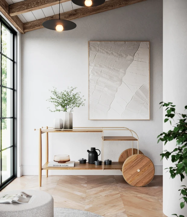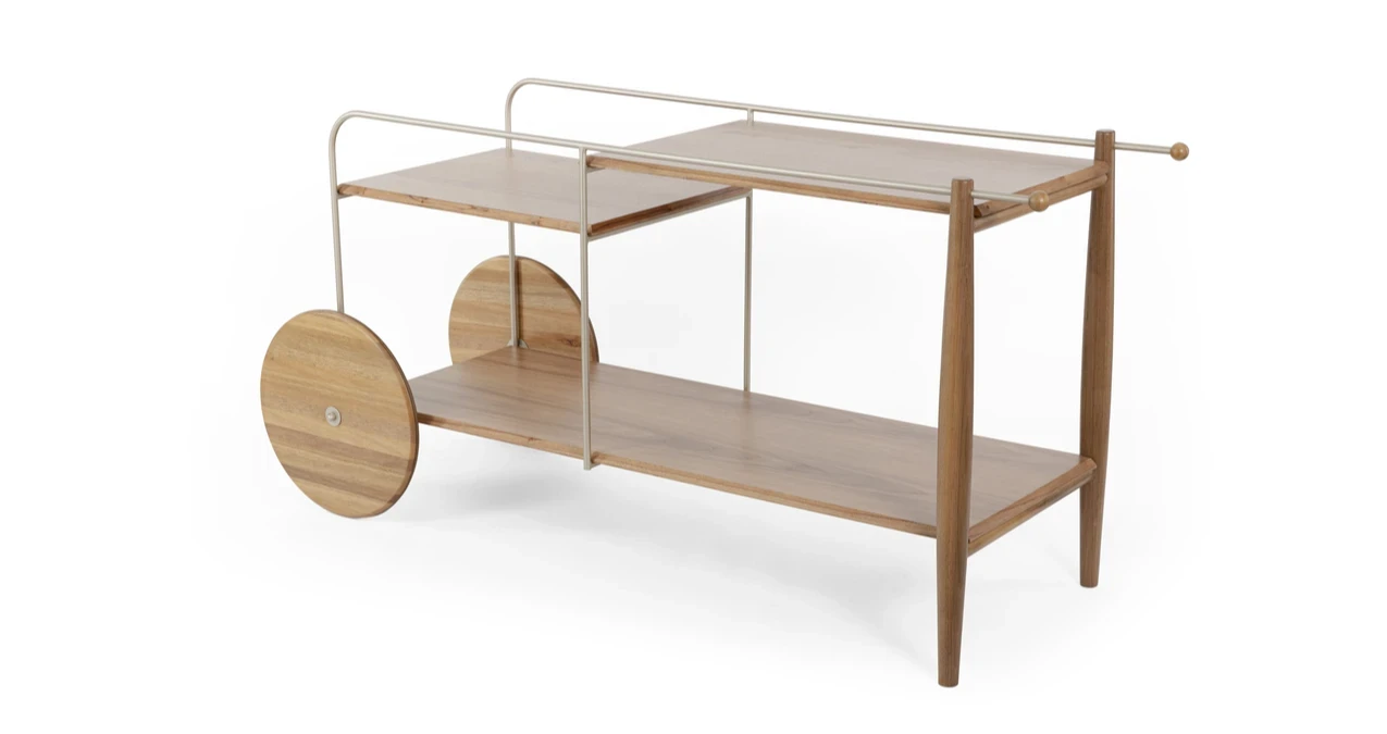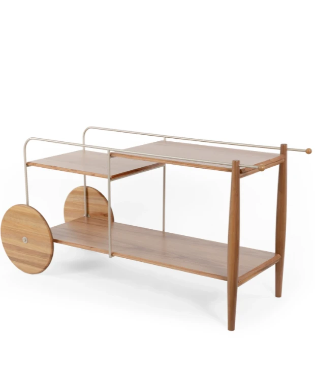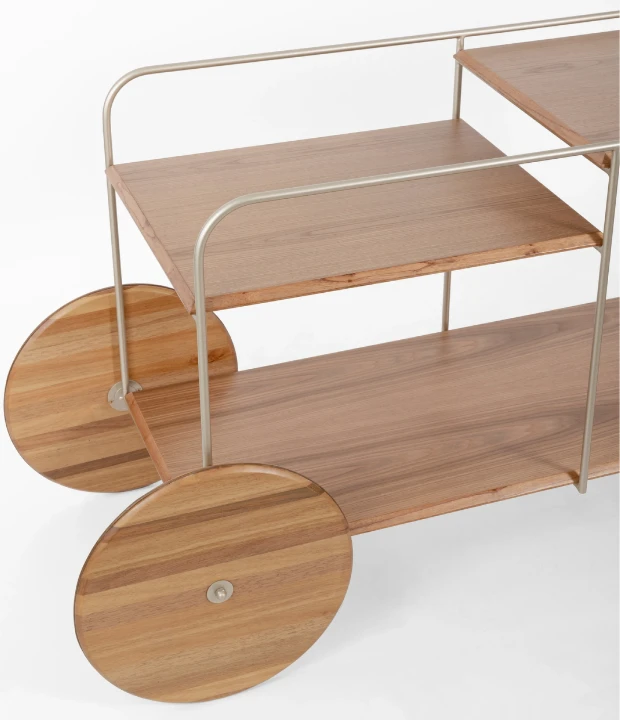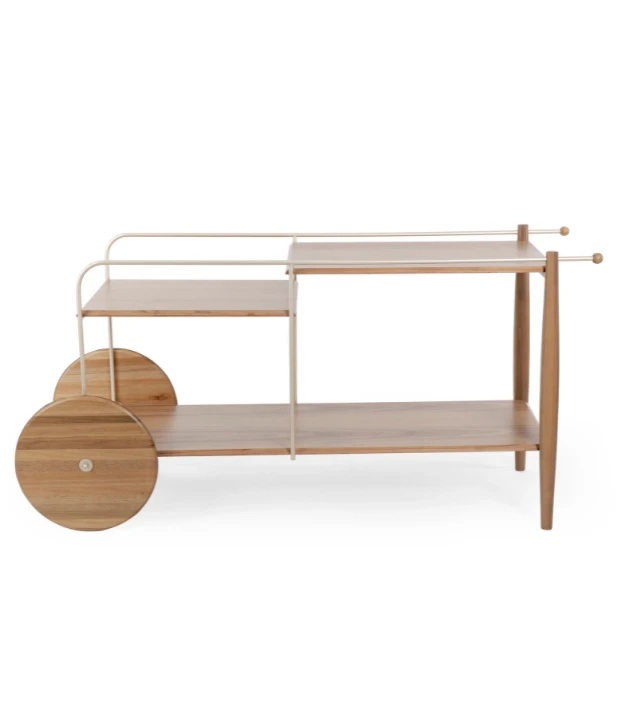 O bar Salinas possui tampos de MDF revestido com lâmina natural de madeira, rodas e pés em madeira maciça e estrutura em aço carbono.