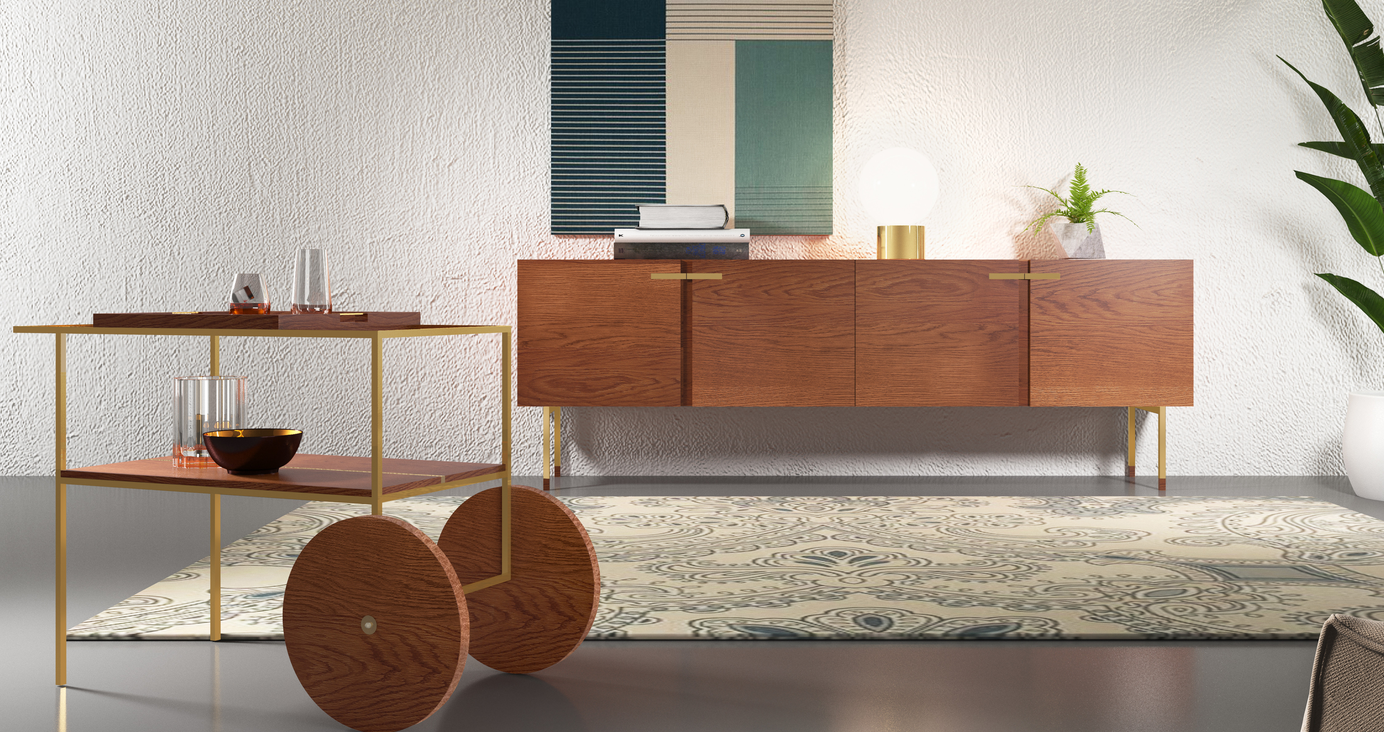 O buffet Syen é confeccionado em MDF revestido com lâmina natural de madeira e pés metálicos com detalhe em madeira maciça. Possui portas com puxadores embutidos feitos de chapa metálica, dobradiças slow motion (sistema de amortecimento) e gavetas internas com