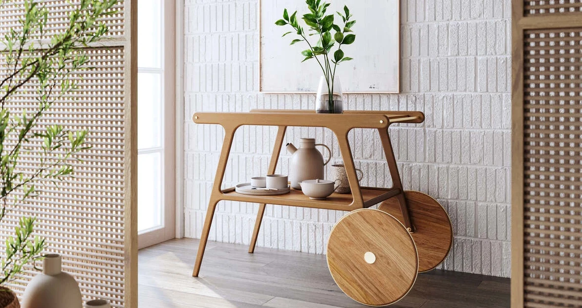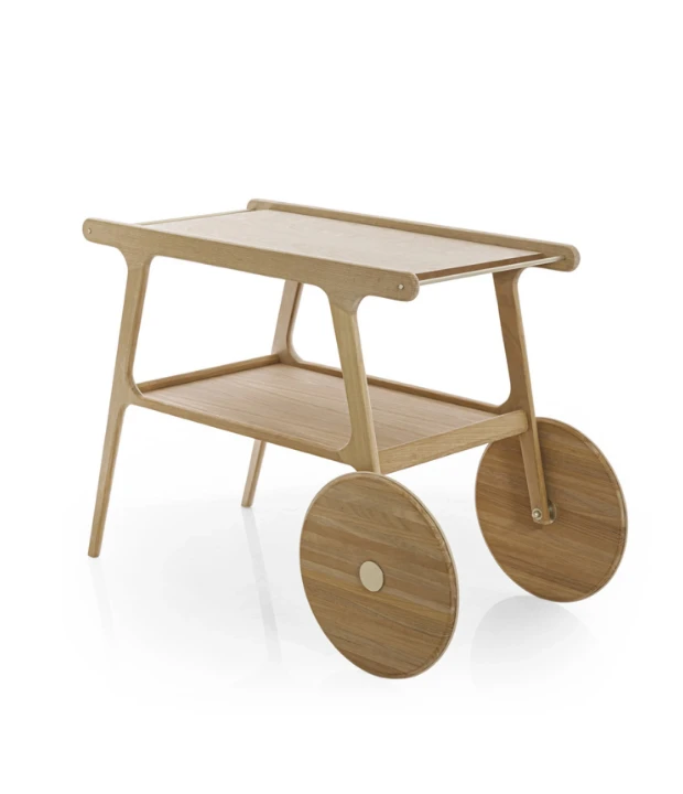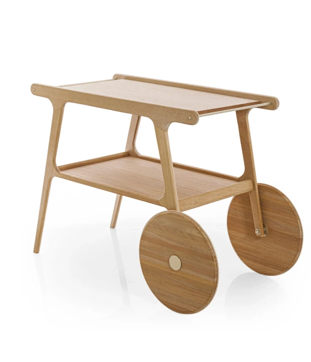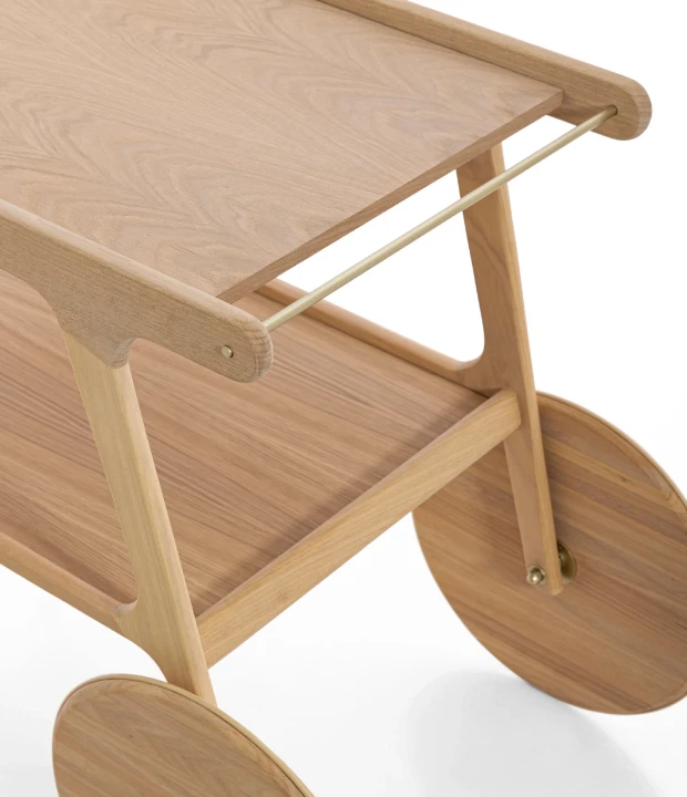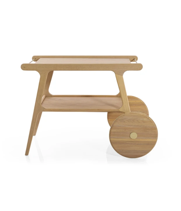 Aspecto fluido, curvas suaves e forte protagonismo da madeira maciça são as principais características do carrinho de chá Torii. Inspirado na cultura japonesa e, como o nome já sugere, teve sua forma baseada nos portais presentes em santuários. Possui tampos em MDF revestido com lâmina natural de madeira e hastes em aço carbono, que contrastam com a madeira e auxiliam no manuseio da peça, buscando ser o essencial: um apoio para servir no dia a dia.