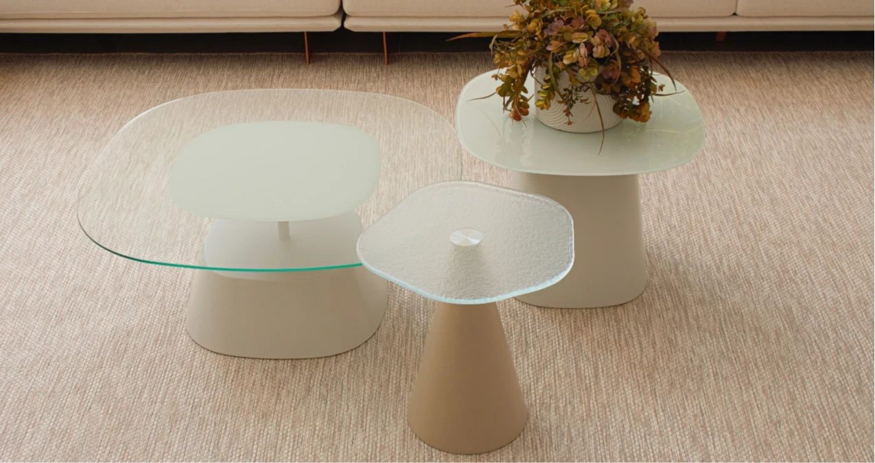 Com uma base elegante em forma de cone, o conjunto Flora está disponível em duas opções de material: madeira maciça ou MDF laqueado. Seu tampo apresenta um formato orgânico, assemelhando-se a uma flor, e pode ser escolhido entre vidro translúcido, fumê ou âmbar.