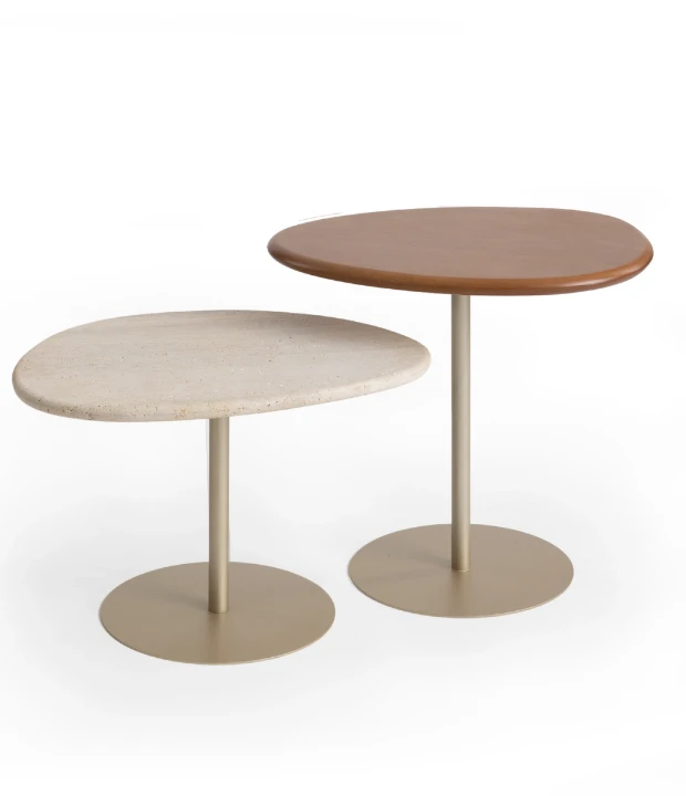 Com um design que evoca a delicadeza de uma pétala de flor, o conjunto de mesas Pétala exibe um tampo versátil. Disponível em opções de madeira, laca ou pedra. Sua base é confeccionada em metal, proporcionando uma combinação elegante e funcional.