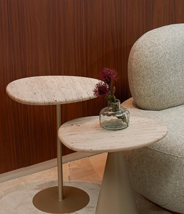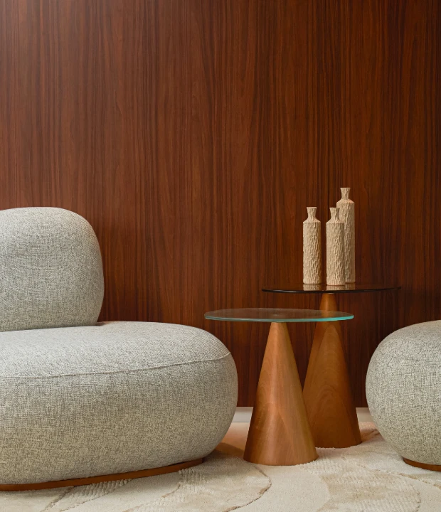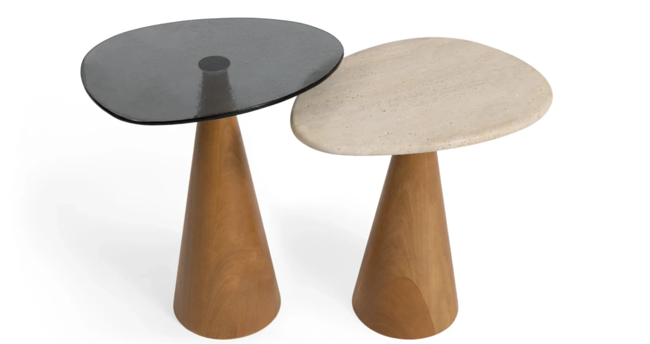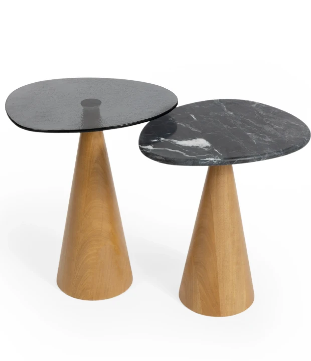 Com uma base em formato cônico, o conjunto Semente também possui um tampo orgânico, podendo ser confeccionado em madeira, laca ou pedra. A base é produzida em madeira maciça ou MDF laqueado.