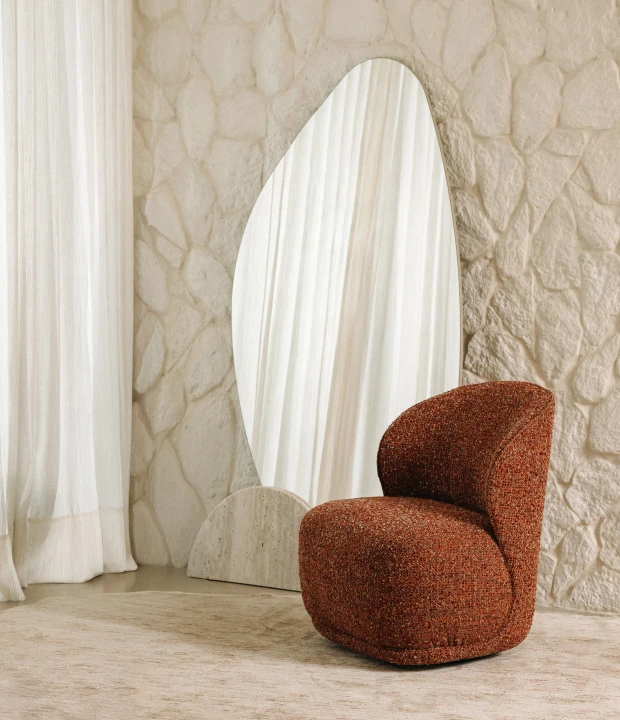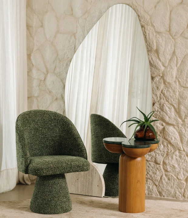 Com estrutura em MDF e base disponível em pedra natural, madeira maciça ou MDF laqueado, o Espelho Folha une forma orgânica e contraste de materiais. Representa o movimento da natureza com leveza e equilíbrio visual.