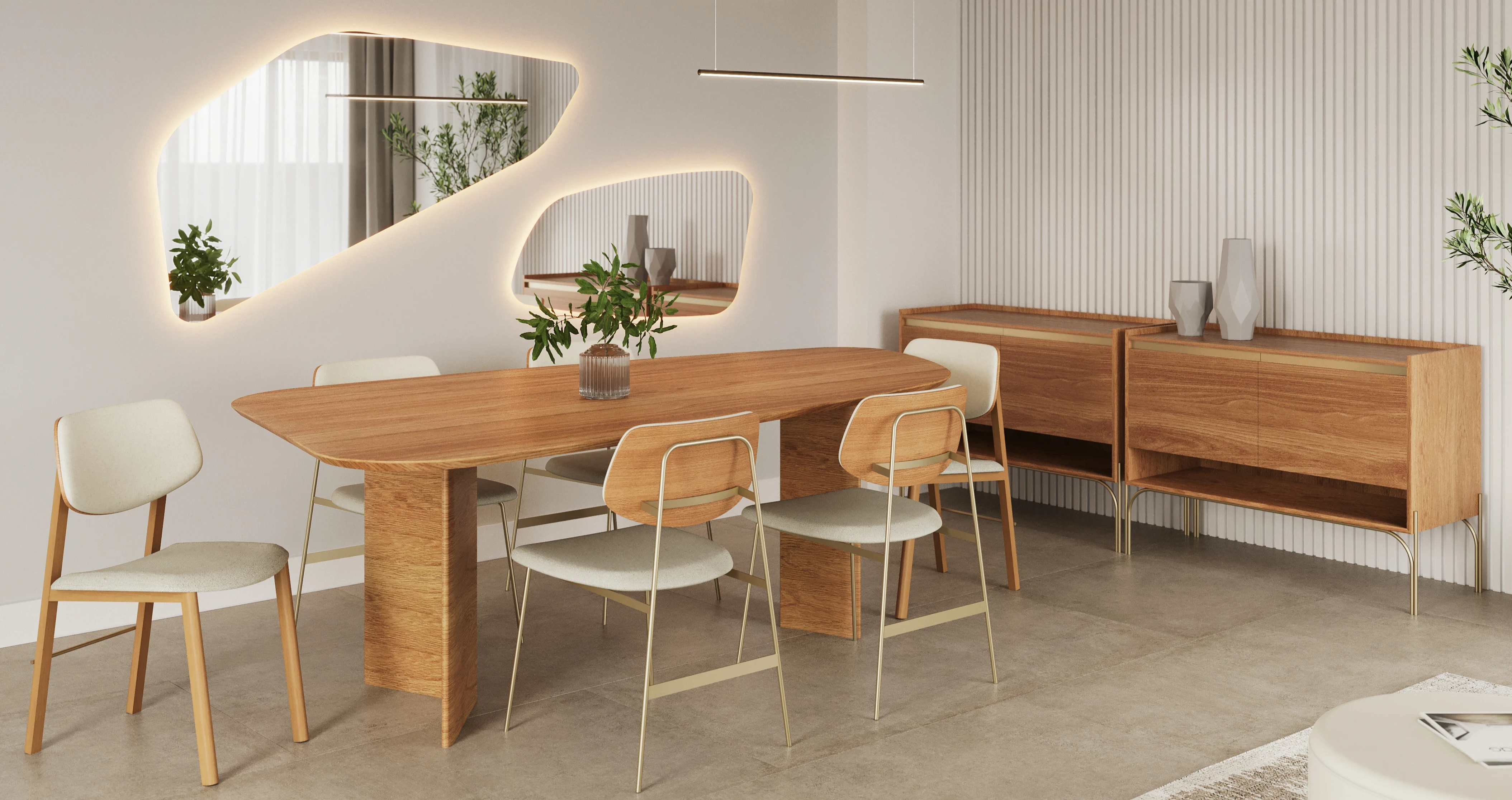 Os espelhos Lumi possuem base de MDF laqueado e envoltório com LED. Dispõem de dois penduradores que permitem instalá-los na horizontal ou vertical, assim como ajustá-los na angulação desejada.