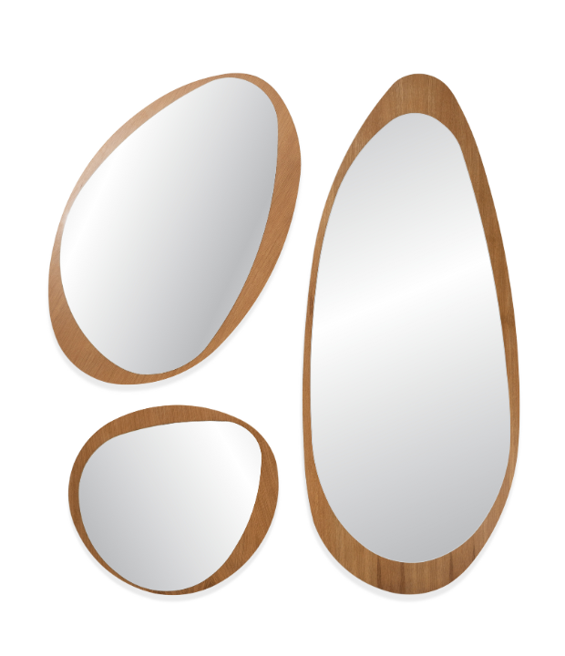 Os espelhos Oásis possuem uma moldura de MDF que podem ser confeccionadas em lâmina natural de madeira ou laqueada. Na face posterior, são equipados com dois penduradores, permitindo uma instalação versátil, seja na posição vertical ou horizontal.