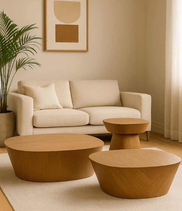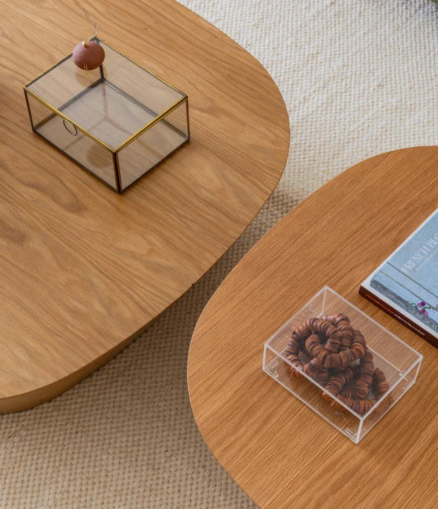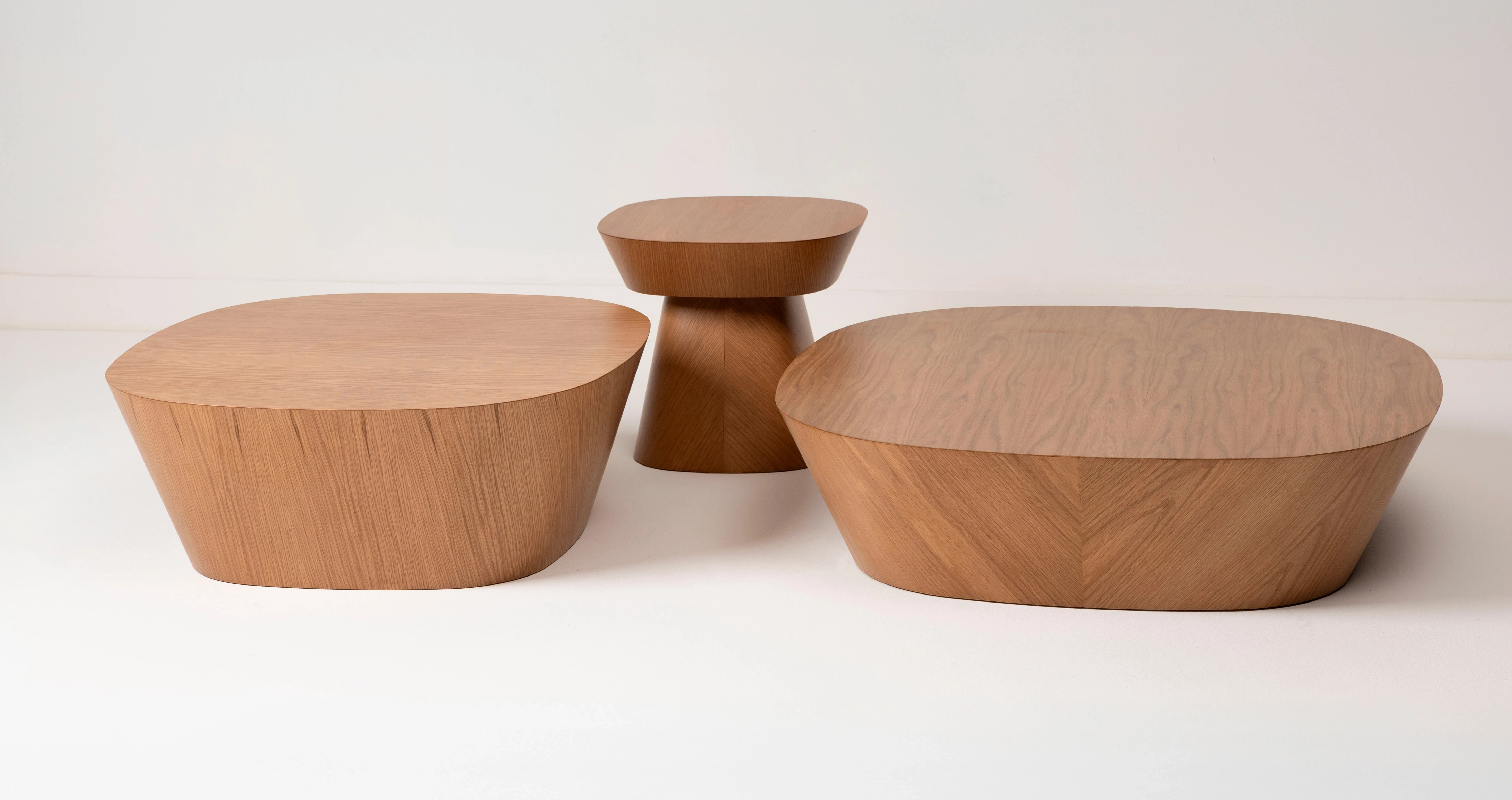 Disponível em acabamentos de MDF laqueado, laminado ou com textura de cimento queimado, a mesa de centro Bloco se destaca pela forma que remete a um volume sólido. Suas proporções generosas e o desenho geométrico conferem ao ambiente uma presença marcante. Os dois modelos maiores são formados por um único bloco, enquanto a versão menor apresenta base e tampo separados, com geometrias semelhantes dispostas em posição invertida.