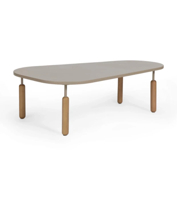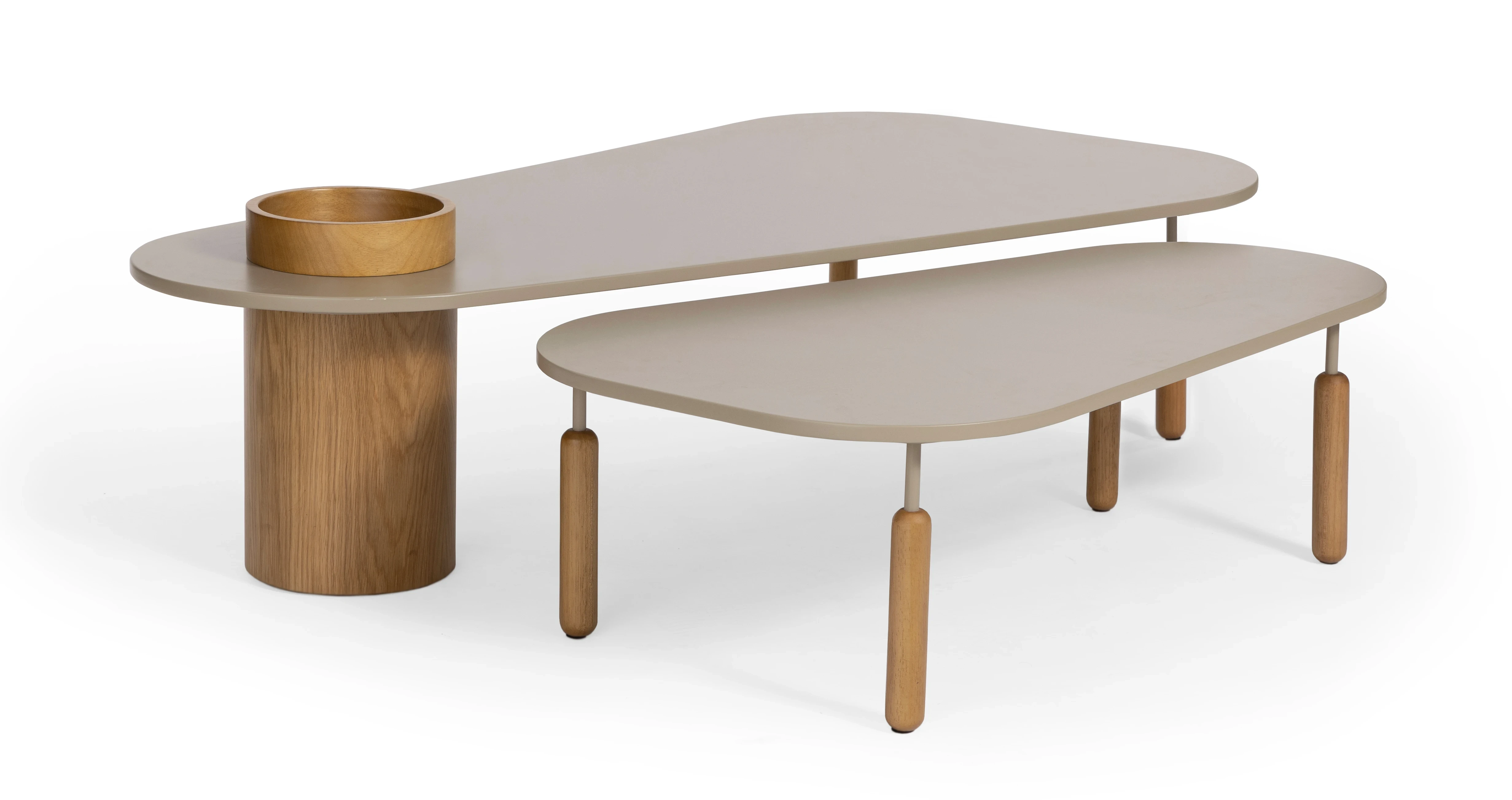 A mesa de centro Ceci possui tampo de MDF laqueado ou revestido em lâmina natural de madeira, pés de madeira com detalhe em aço e, na versão maior, uma base laminada com um mini cachepô em seu tampo.
