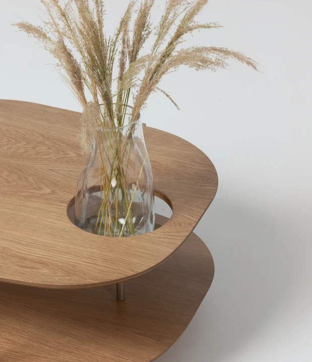 Com um design orgânico, a mesa de centro Creta é confeccionada em MDF com lâmina natural de madeira ou acabamento laqueado. Além dos seus pés produzidos em metal, a mesa possui um prato metálico fixado na prateleira inferior que, junto a abertura no tampo, dão lugar a utilização de jarros e similares.