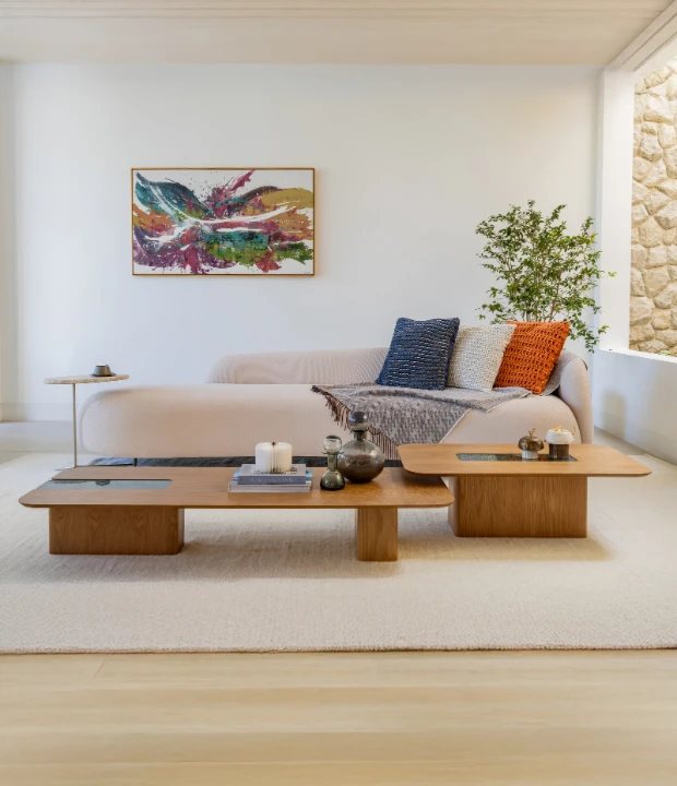 A mesa de centro Flauta é produzida em MDF laqueado ou revestido em lâmina natural de madeira, com detalhe no tampo, disponível em pedra, madeira ou MDF laqueado.
