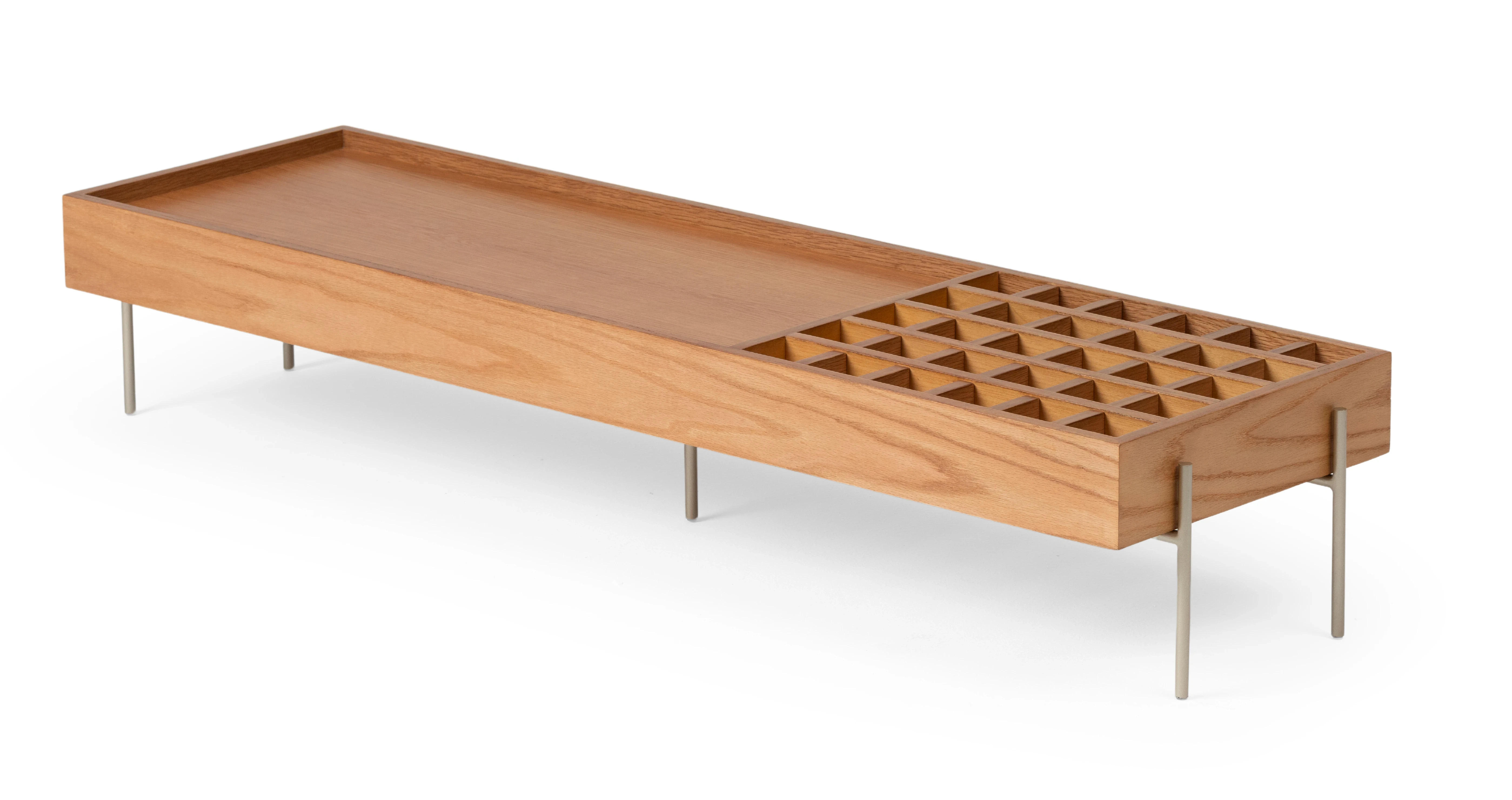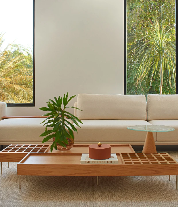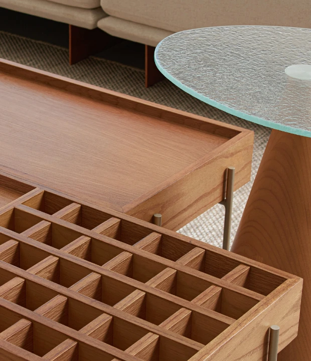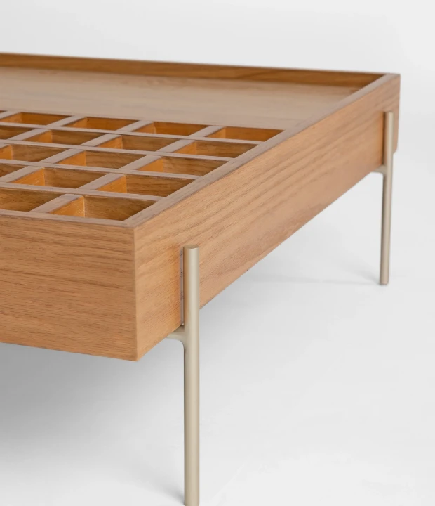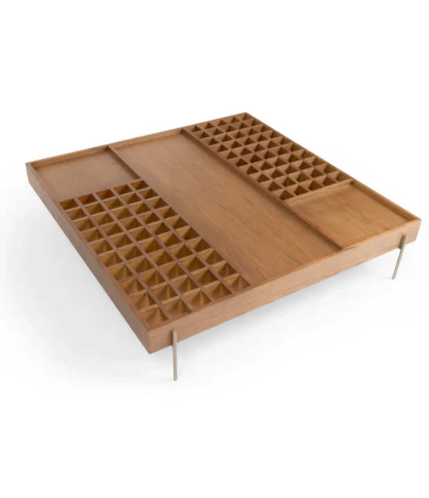 A Mesa de Centro Garden é uma peça de mobiliário inspirada na beleza e na harmonia encontradas nos jardins europeus. Este conceito combina elementos geométricos e uma estética elegante para trazer a sensação de um oásis natural para o interior da casa. A Garden é produzida em MDF revestido com lâmina natural de madeira e pés em metal.