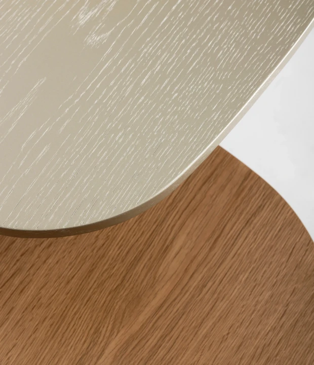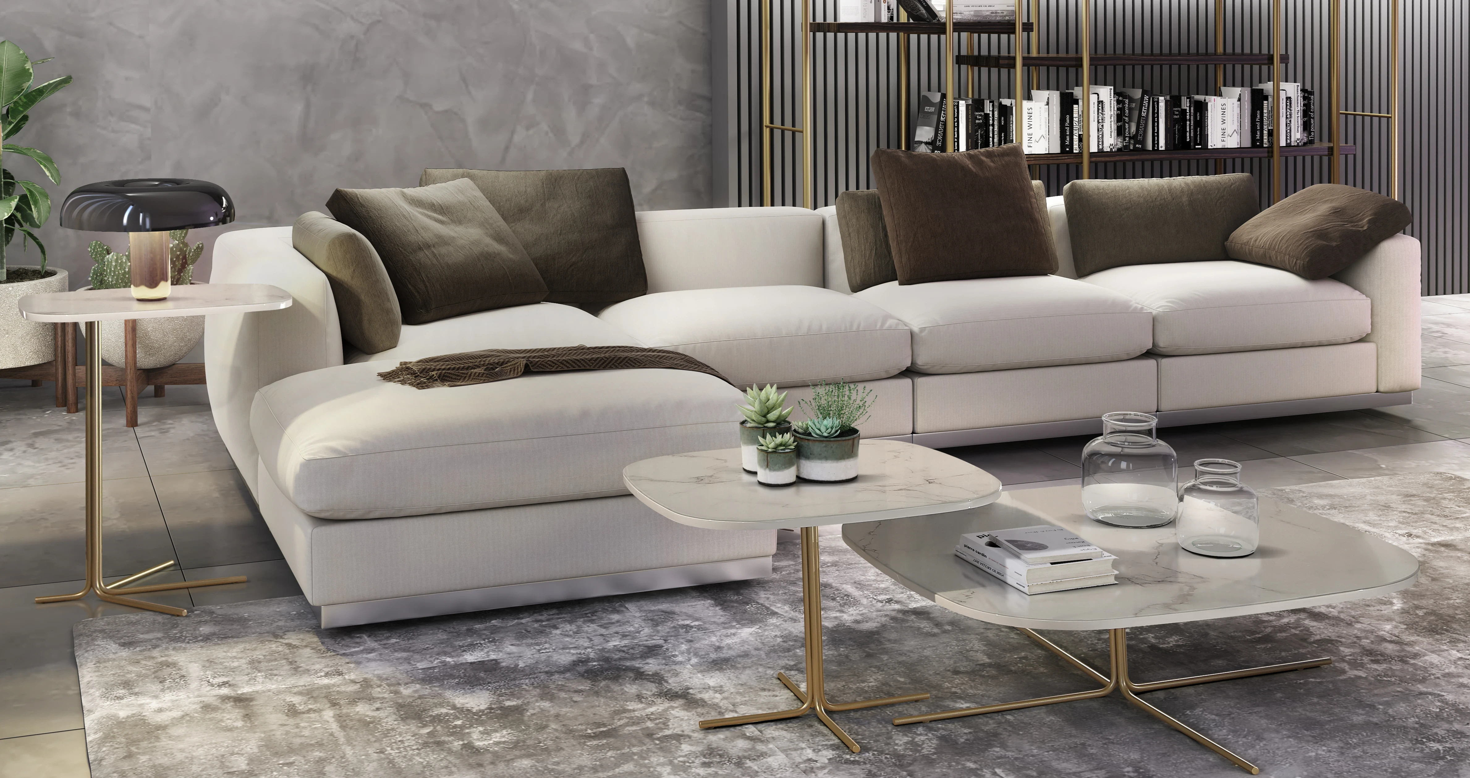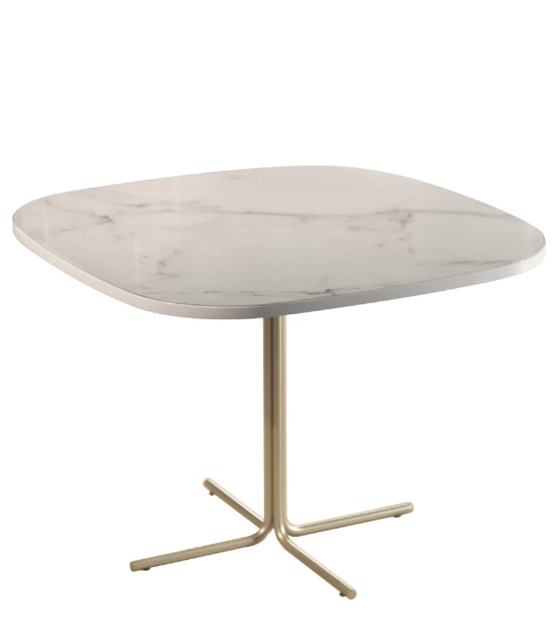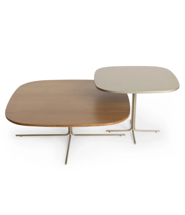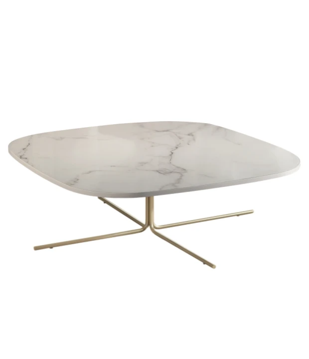 A mesa de centro Mos possui tampo de MDF com vidro sobreposto laqueado ou marmorizado e pés em aço carbono.