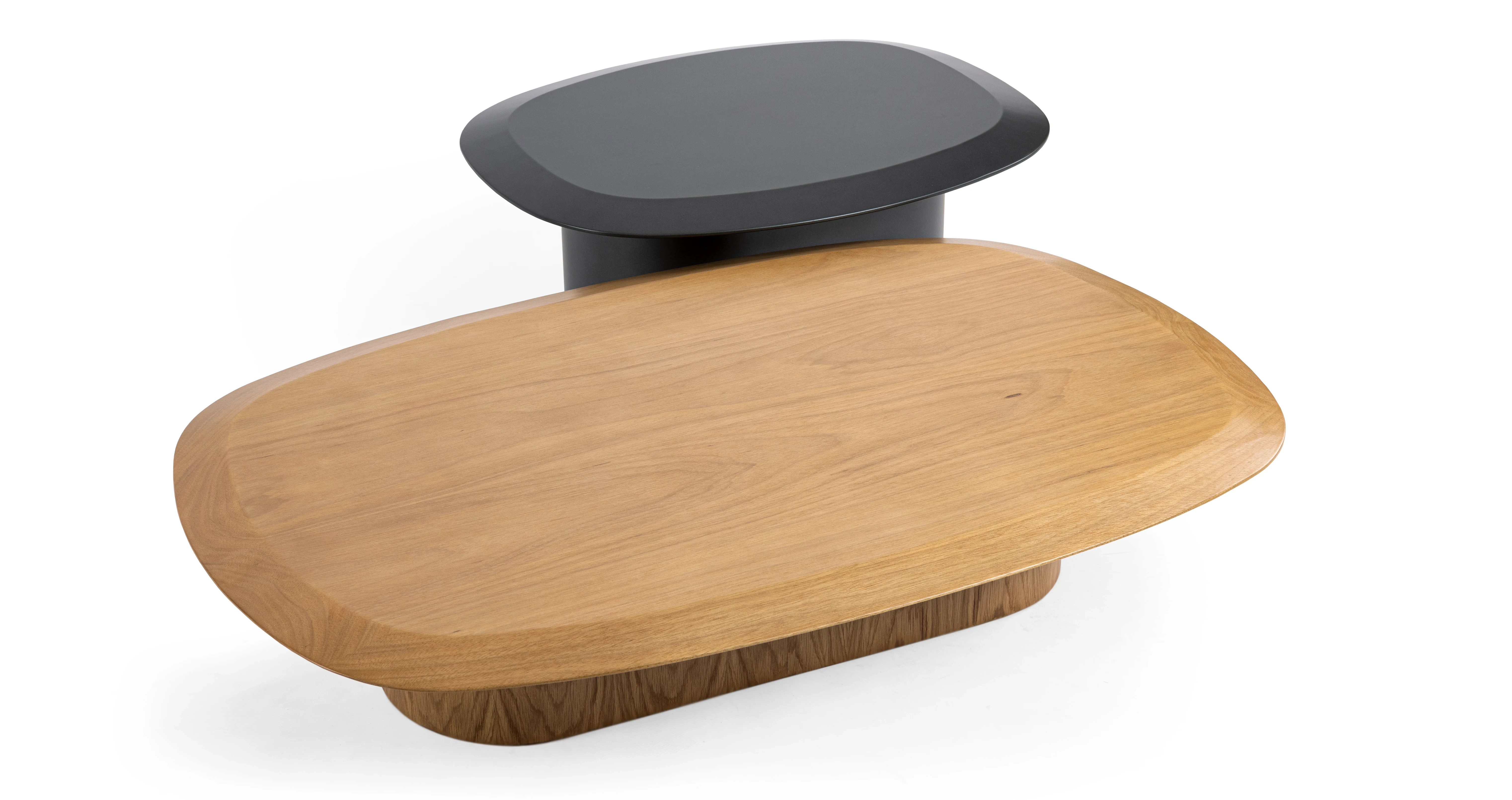 Possui tampo de madeira maciça e base revestida em lâmina natural de madeira. Também há opção de acabamento laqueado.