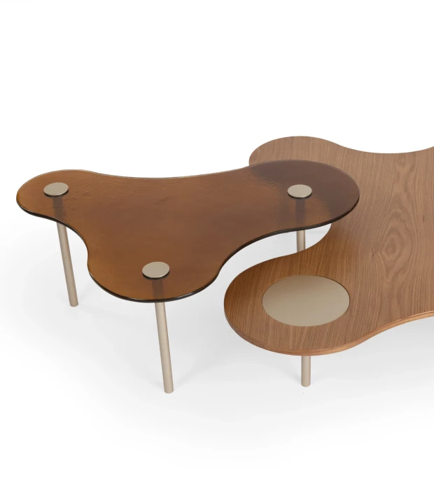 Com um design completamente orgânico, a mesa de centro Pampulha é confeccionada em MDF com lâmina natural de madeira ou acabamento laqueado, tendo seus pés produzidos em metal. Em seu tampo há detalhes em metal. Na versão menor há também a opção de ser confeccionada em vidro fusion.